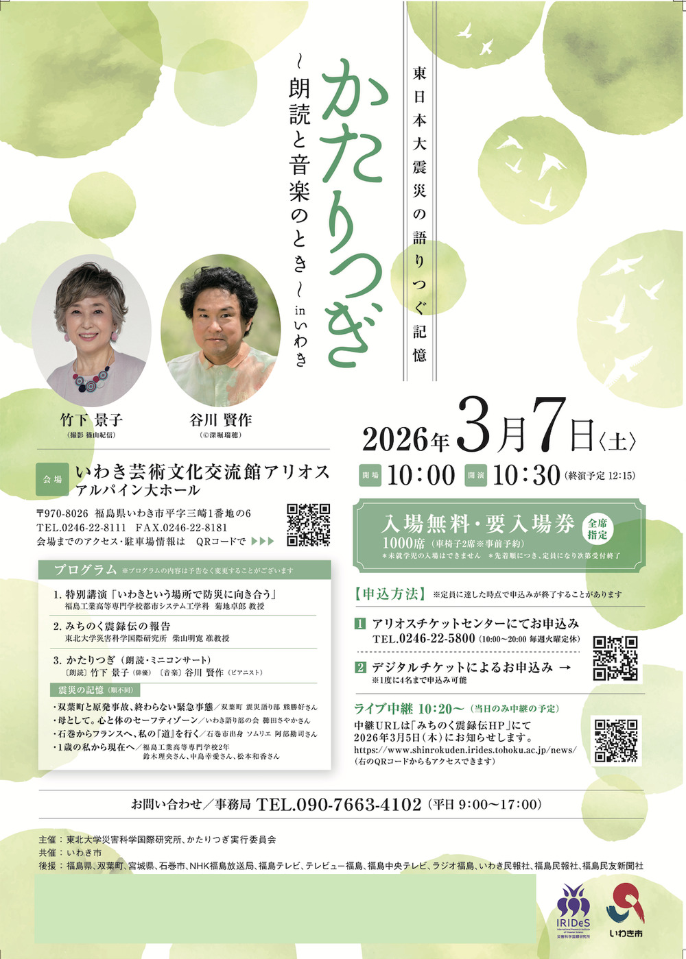 本事業は、東北大学災害科学国際研究所が、俳優の竹下景子さん、ピアニストの谷川賢作さんとともに毎年開催しています。