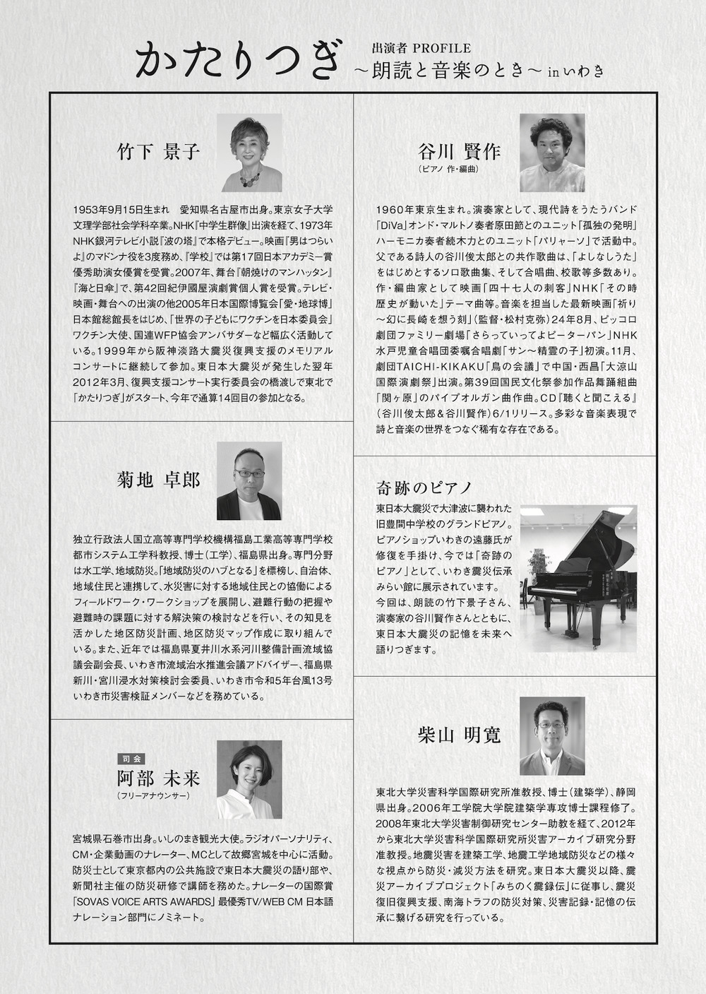 語り部は、俳優の竹下景子さん。音楽を添えるのは、ジャズピニストで作編曲家としても定評のある谷川賢作さんです。