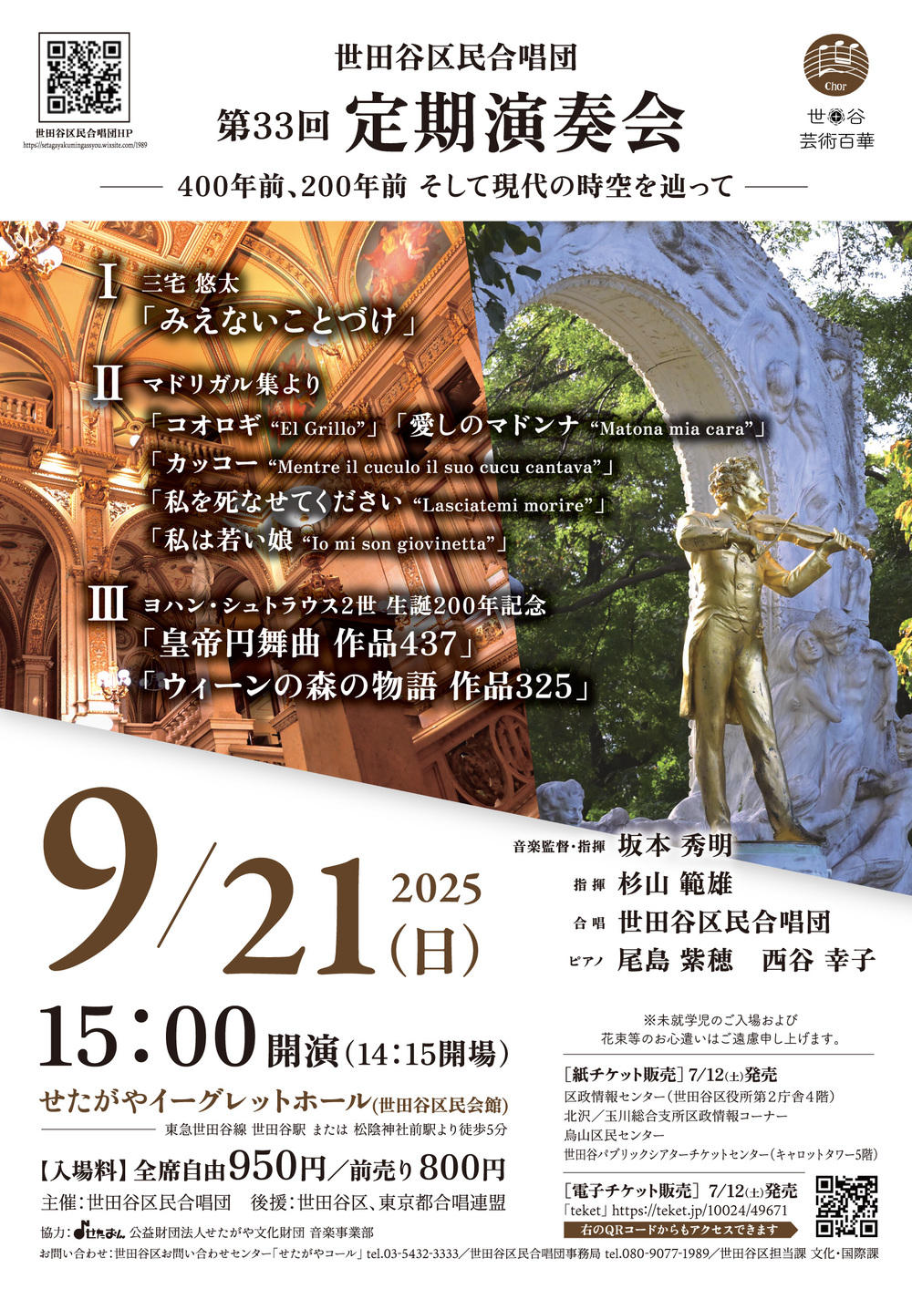 ヨハン・シュトラウス2世は今年、生誕200年のメモリアルイヤーですので彼の三大ワルツから「ウィーンの森の物語」、「皇帝円舞曲」を歌います。皇帝円舞曲は、音楽監督の坂本が今回新たに作詞した歌詞でお楽しみください。