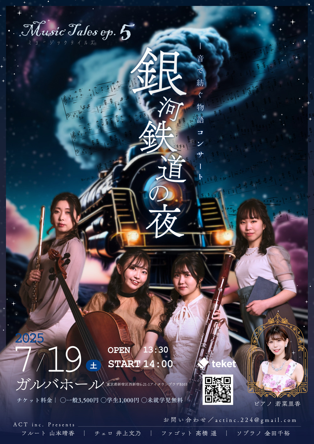 宮沢賢治作の『銀河鉄道の夜』を題材に、クラシックの名曲の数々をお届けします。大人も子どもも楽しめる、音と物語の世界へ。