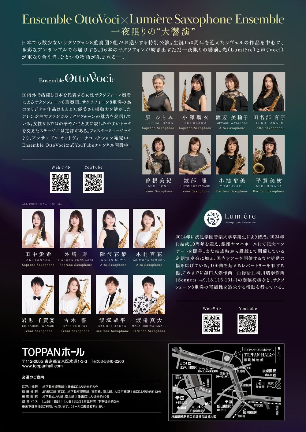 日本でも数少ないサクソフォン8重奏団体2組がお送りする特別公演。生誕150周年を迎えたラヴェルの作品を中心に、多彩なアンサンブルでお届けする。