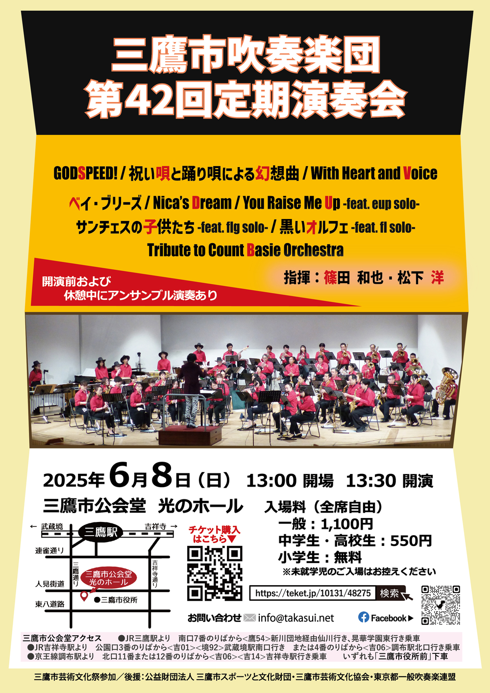 三鷹市吹奏楽団、通称「鷹吹」は、創設以来「吹奏楽にジャズ・ポップスを取り入れることにより、吹奏楽という演奏形態における音楽的な可能性を探求していく」という観点を持って活動しています。そのため、今年も吹奏楽オリジナルからJAZZまで幅広く、そしてかなり攻めた選曲となっています。第一部は鷹吹初挑戦となる楽曲2曲に加えて8月に行われる吹奏楽コンクールの課題曲を、第二部では「Tribute to Count Basie Orchestra」ほか鷹吹の得意とするJAZZ&POPSの名曲をお届けします。是非吹奏楽愛好家からJAZZファンまで奮ってご参加ください。皆様のご来場を心よりお待ちしております。