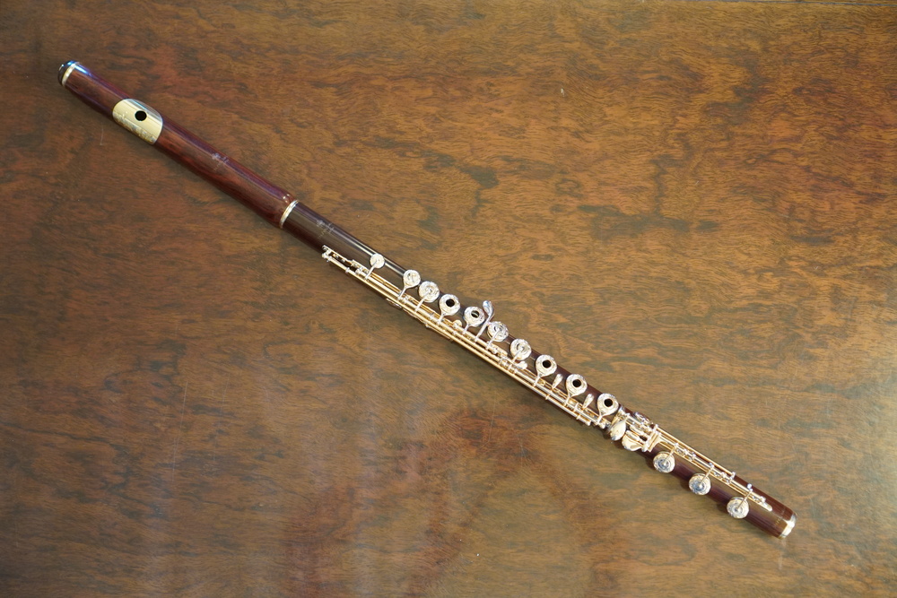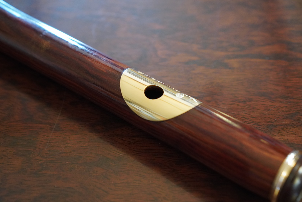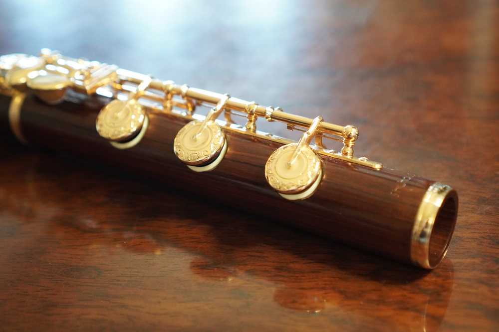 日本のフルートメーカーの中で木製フルート制作の草分け的存在の「桜井フルート制作所」に制作していただきました。1847年にベームが作り上げた初期円筒管を理想としたこの作品は、オープンG♯システムとベーム式親指キィを採用し、トーンホールは足部管まで同一径になっております。管体は19世紀ヨーロッパで木管制作に多用されたコーカスウッドを使用し、メカニズムは総14金製、リッププレートは18金製で、歌口はバロックフルートのような極小のオーバル型です。