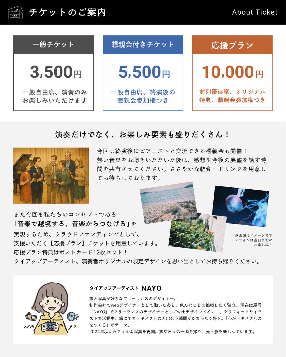 なお、本公演では、私たちのコンセプトである「音楽で越境する、音楽からつなげる」を実現するため、クラウドファンディングとして支援いただく【応援プラン】チケットを用意しています。