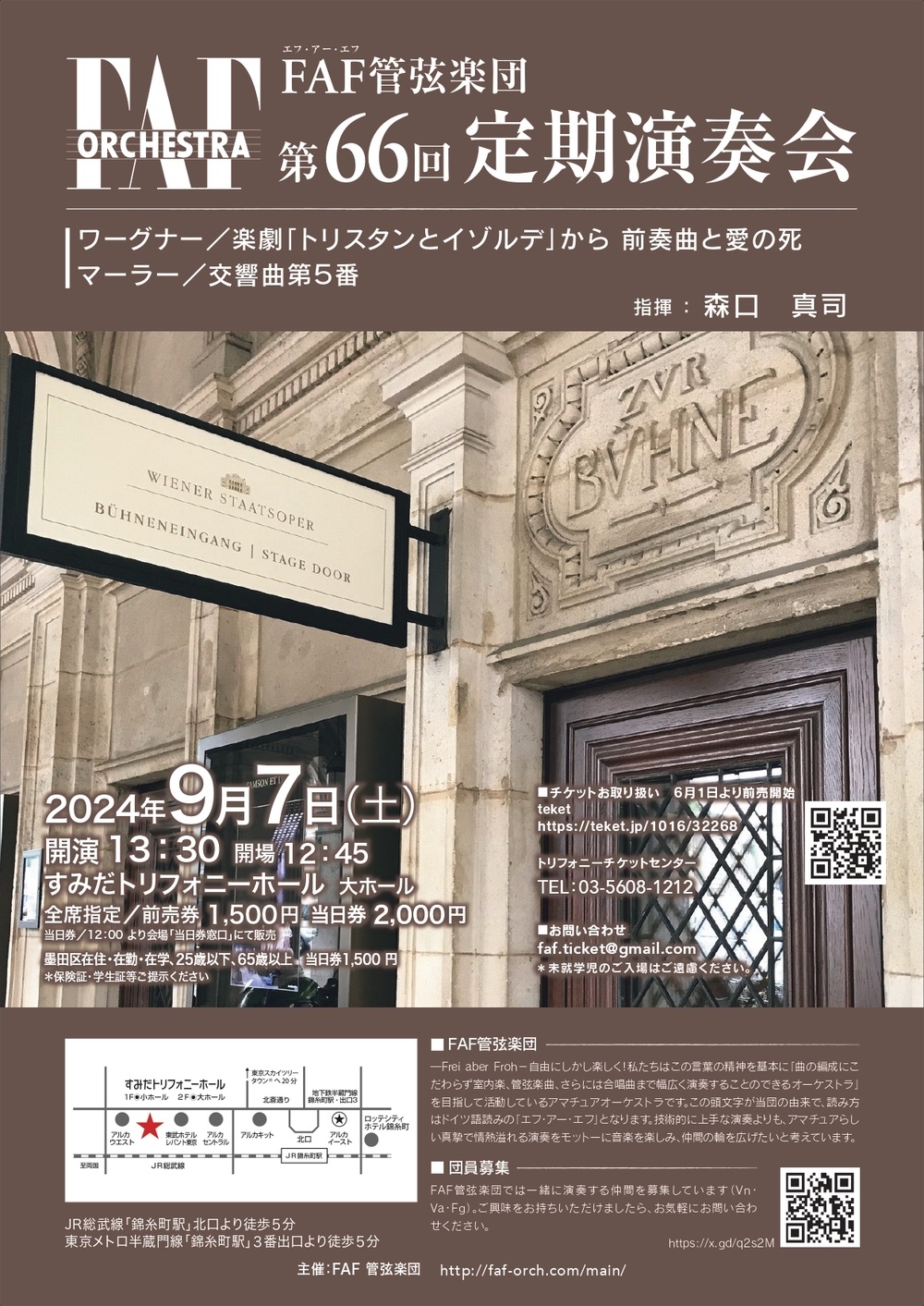 第66回定期演奏会では、ワーグナーの「トリスタンとイゾルデ」からの前奏曲とマーラーの交響曲第5番を演奏致します。交響曲第5番は、1時間を超える大作でありながら、美しいメロディーで有名な4楽章アダージェットなど聴く者を飽きさせない、マーラーの交響曲の醍醐味を堪能できる作品です。情熱的な愛と死のテーマを美しく描いた、ワーグナーの「トリスタンとイゾルデ」との対比を通じて、それぞれの作曲家たちの魅力をお楽しみください。