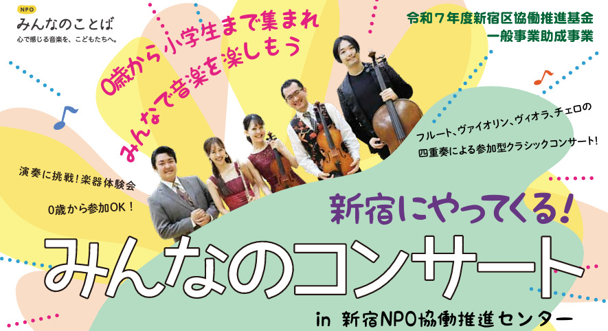 音楽で子どもの心を育てるNPOみんなのことばによる、親子で楽しむ「みんなのコンサート」のご案内です。今回は、新宿区の助成事業によって新宿区内で開催することとなりました。