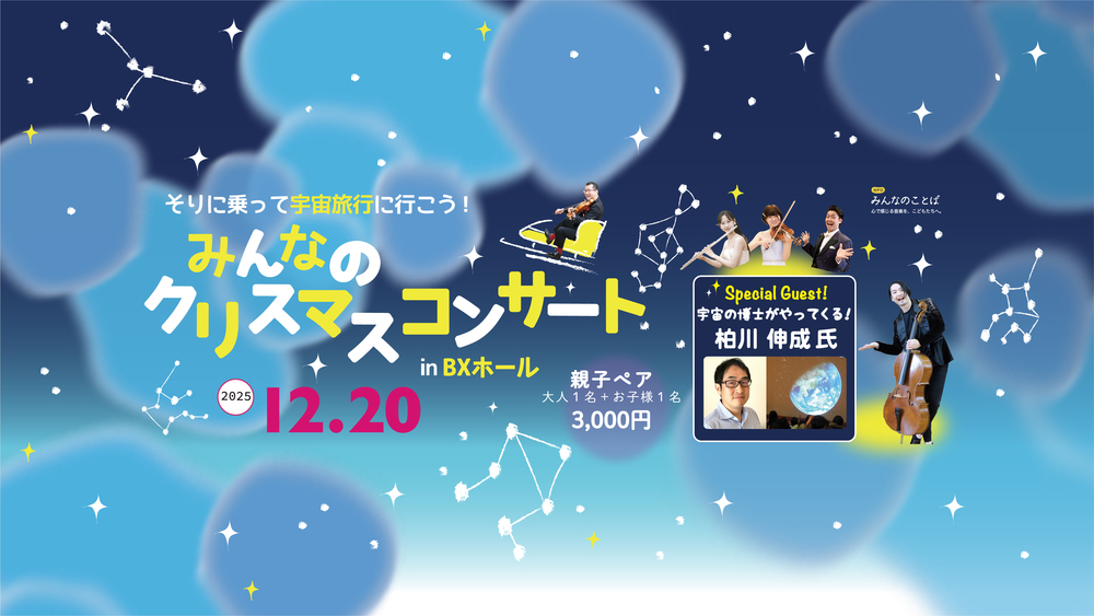 今回はスペシャルゲストに、東京大学より天文学教授の柏川伸成先生をお迎えして、広い宇宙の映像と楽しいお話をコンサートとともにお届けします。宇宙について先生に聞いてみたいことを事前に受け付けています。イベント当日、子どもたちが持っている不思議や疑問に答えてもらいましょう。