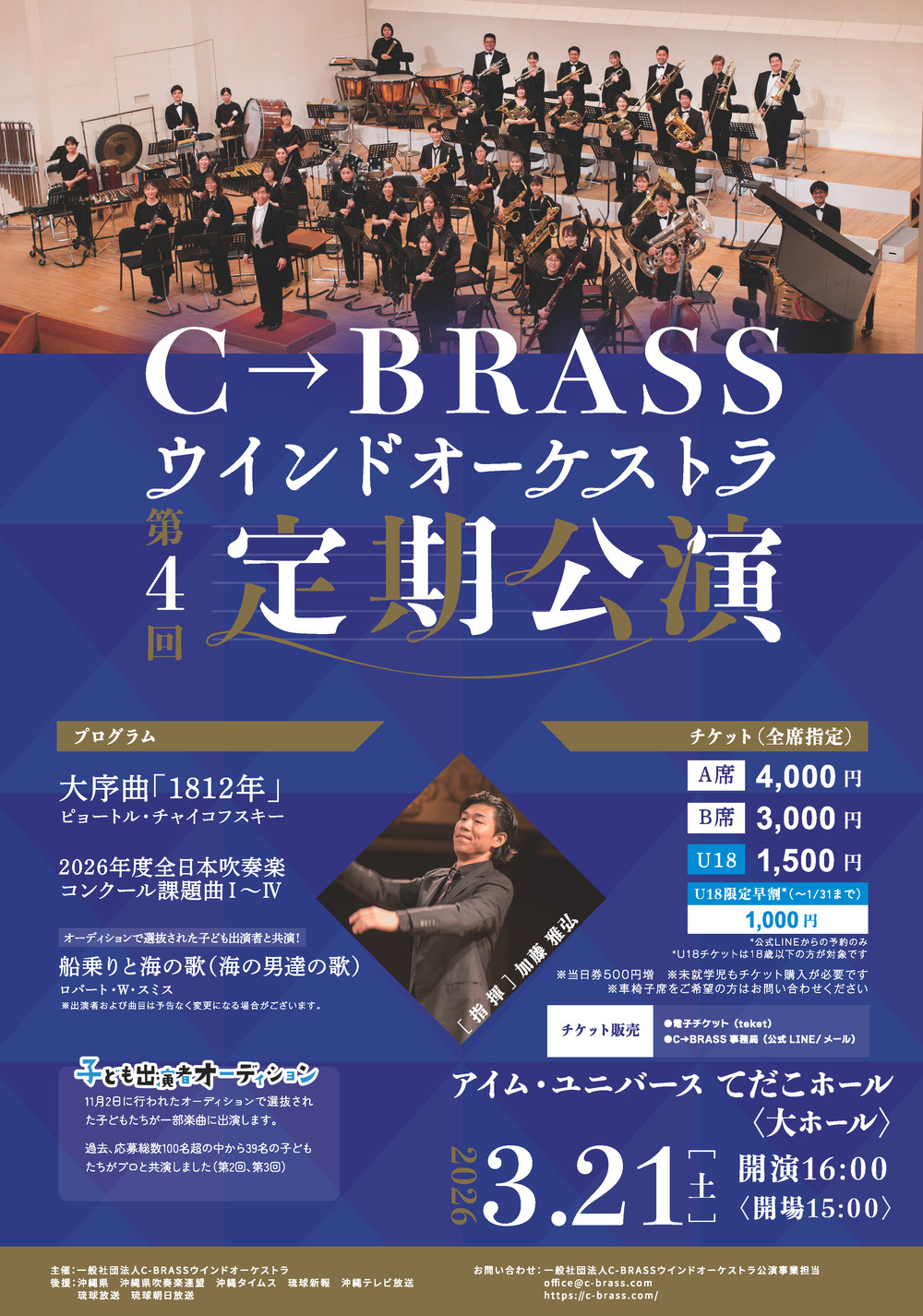 今回の定期公演で4回目を数える。毎年沖縄にゆかりのある作品を取り上げてきたが、今年はかつての吹奏楽コンクール課題曲「コーラルブルー」を披露する。さらに、2026年度吹奏楽コンクール課題曲を沖縄でいち早く紹介できるのも大きな注目点である。加えて、チャイコフスキーの壮大な「1812年」がプログラムに並び、迫力ある響きを会場に響かせる。そして、オーディションに合格した子どもたちが「船乗りと海の歌(海の男達の歌)」で共演し、舞台に新鮮な彩りを添える。