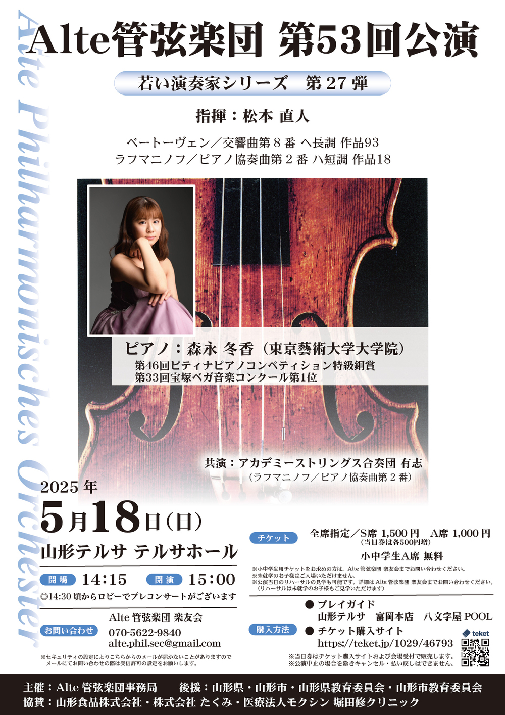 Alte管弦楽団(アルテ管弦楽団)は1999年に山形に縁のあるメンバーで結成し、主に山形市内で活動しています。結成時はベートーヴェン、モーツァルト等古典派の曲目を演奏していましたが、近年は古典派に加えて、バッハ等のバロックや、シューベルト、メンデルスゾーン、チャイコフスキー等ロマン派など様々な作品に取り組んでいます。多様なレパートリーに対応するため、管弦楽、弦楽合奏、管楽合奏等演奏編成をその都度柔軟に組み替えながら活動しています。