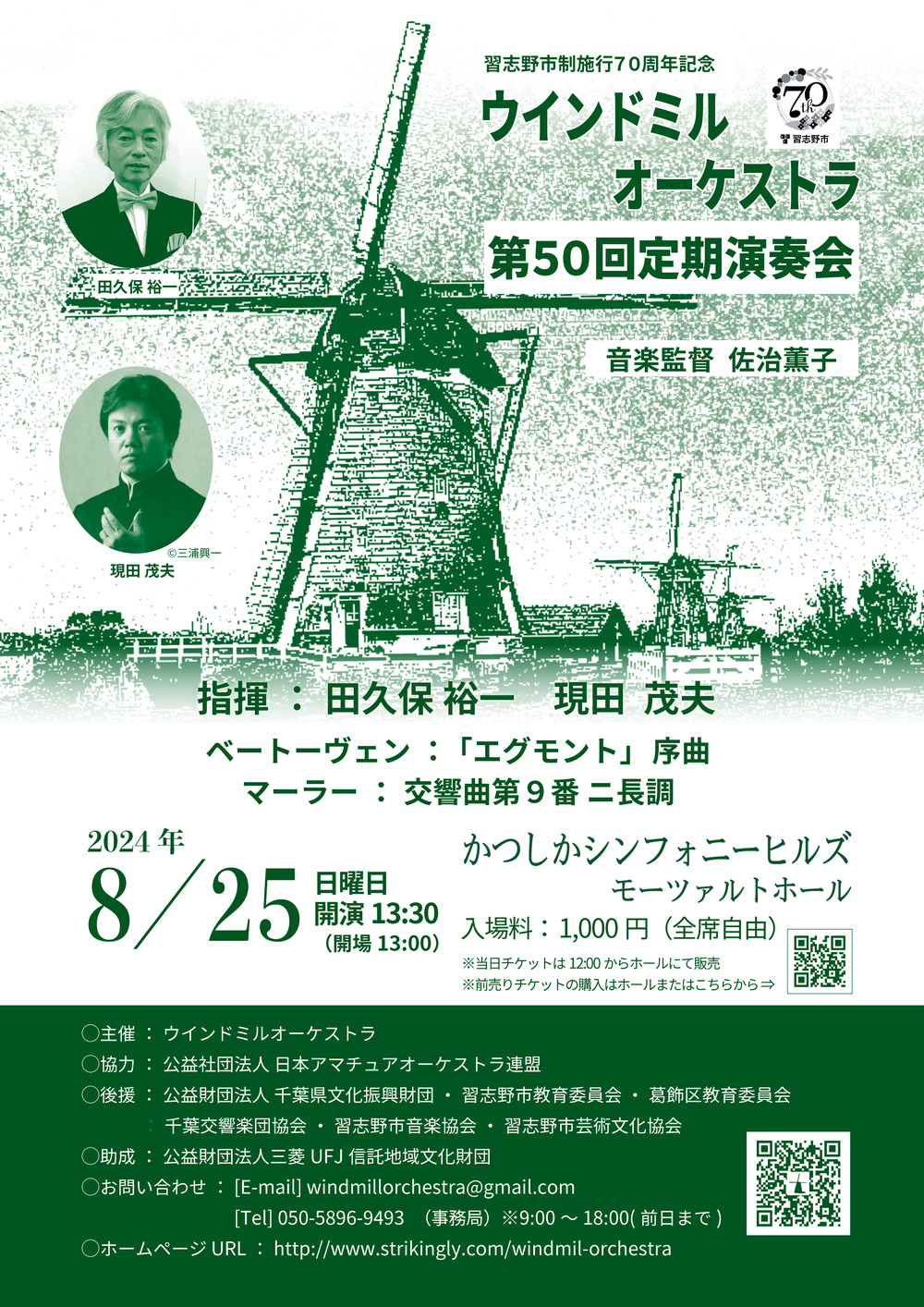 団の創立当初から深く関わりのある田久保裕一氏、現田茂夫氏の両名誉指揮者によるダブルキャストで、50年の節目となる演奏会を飾ります。