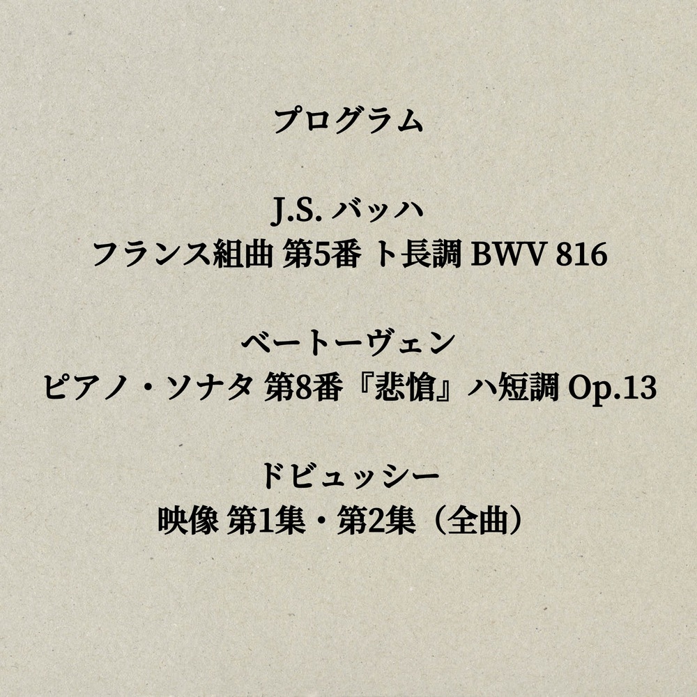 J.S.バッハ フランス組曲第5番 ト長調 BWV816、ベートーヴェン ピアノ・ソナタ第8番 「悲愴」 ハ短調 作品13、ドビュッシー 映像 第1集、第2集