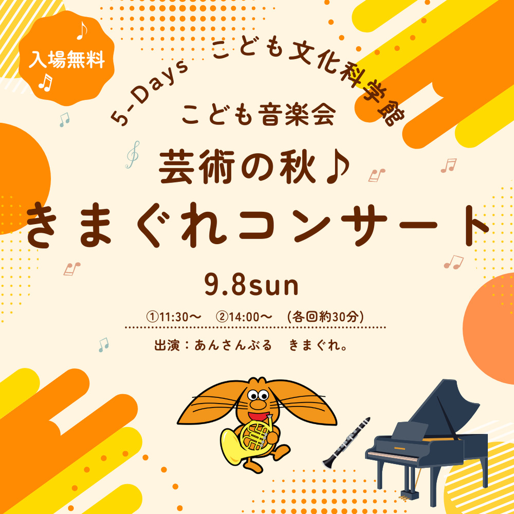 クラリネット・ホルン・ピアノで、秋の曲やみなさんもよく知っている楽しい曲をたくさん演奏します!(各回約30分)