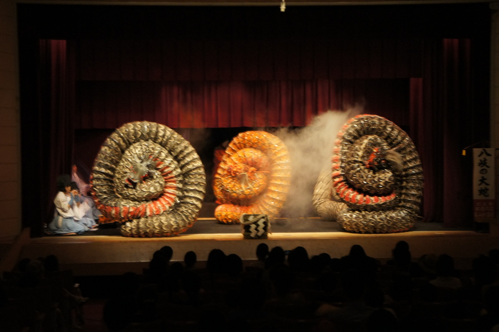 今年は最後に残ったクシナダヒメの番です。悲しみにくれる親子の前を通りかかったスサノオノミコトは「娘をお嫁さんにくれるなら怪物を退治する」と言いました。