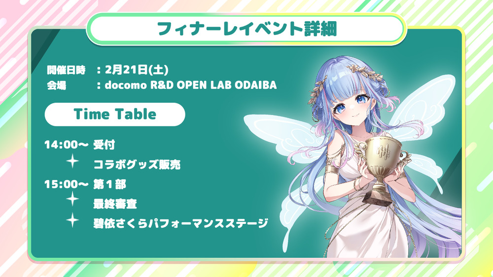最終審査となる本イベントでは、出場権を獲得した4名のVTuberが、メインアンバサダーの「碧依さくら」、オフィシャルサポーターの「苺白ゆに」「奥宮みさと」を前に、最後のテーマに臨みます❤️🔥