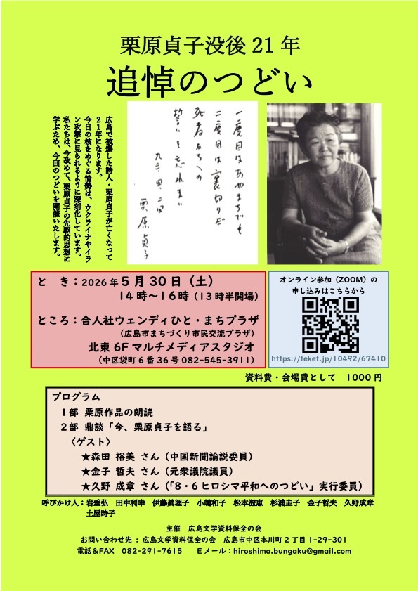 私たちは、今改めて、栗原貞子の先駆的思想に学ぶため、今回のつどいを開催いたします。