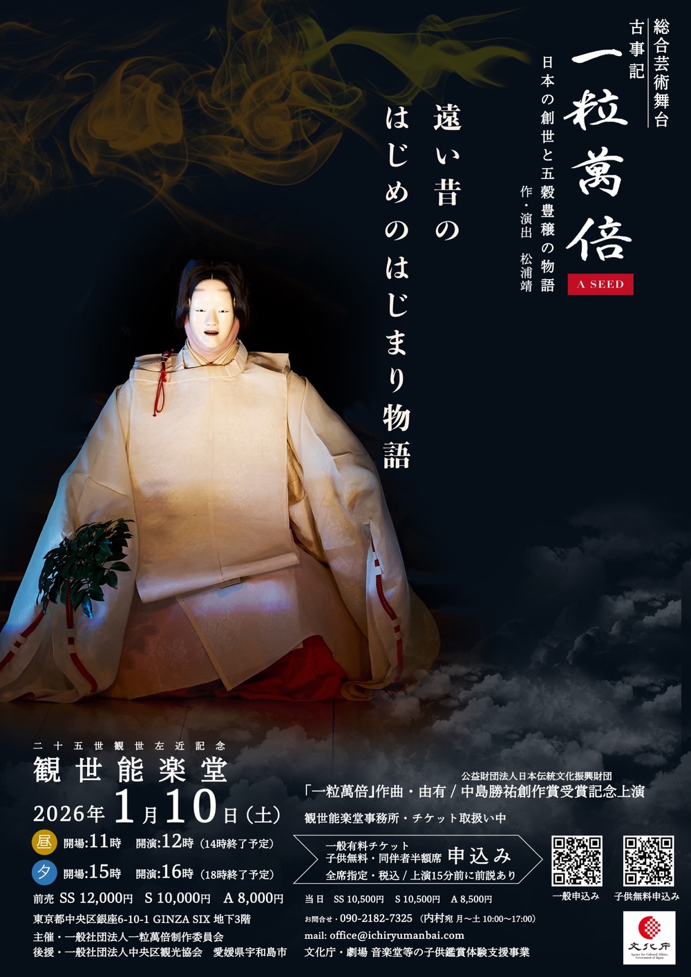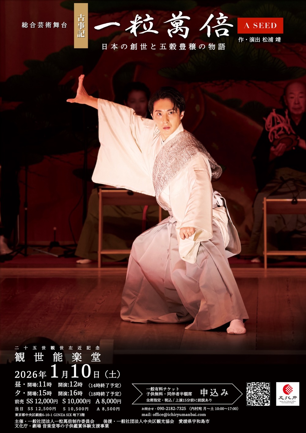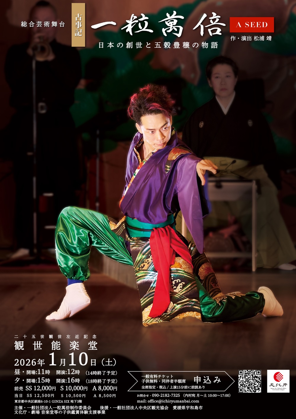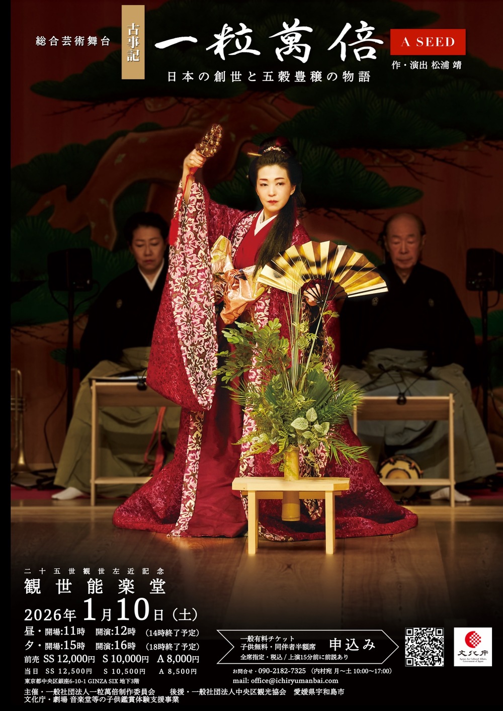 古来より日本では、自然と共に生きることを尊び、その調和の中に美と精神性を見出してきました。総合芸術舞台「一粒萬倍(いちりゅうまんばい)」は、日本最古の書『古事記』の中に描かれた自然観や生命観をベースに「自然との共生」「平和への祈り」をテーマにした新しい舞台作品です。