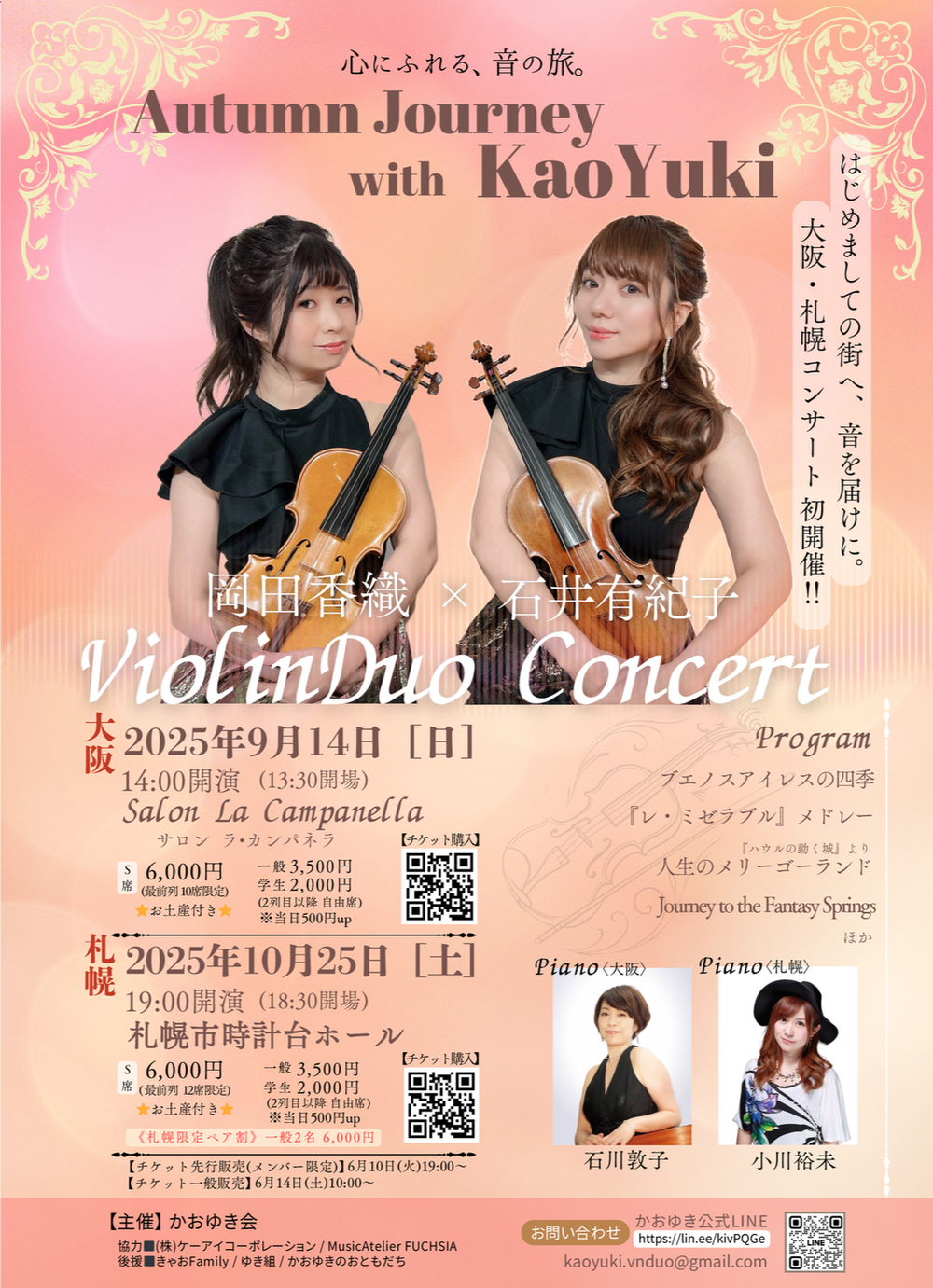 福岡を拠点に活動するバイオリンデュオ「かおゆき」が、はじめての札幌でのコンサートを開催します🎻🎻❄️