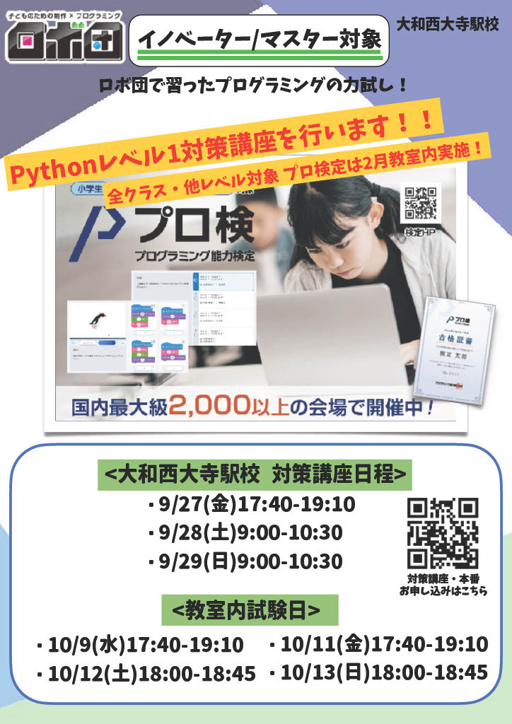 今回イノベーターマスタークラス在籍生のうち「Pythonレベル1」受験の生徒のみ先立ってプログラム検定の対策講座及び本試験を実施いたします。