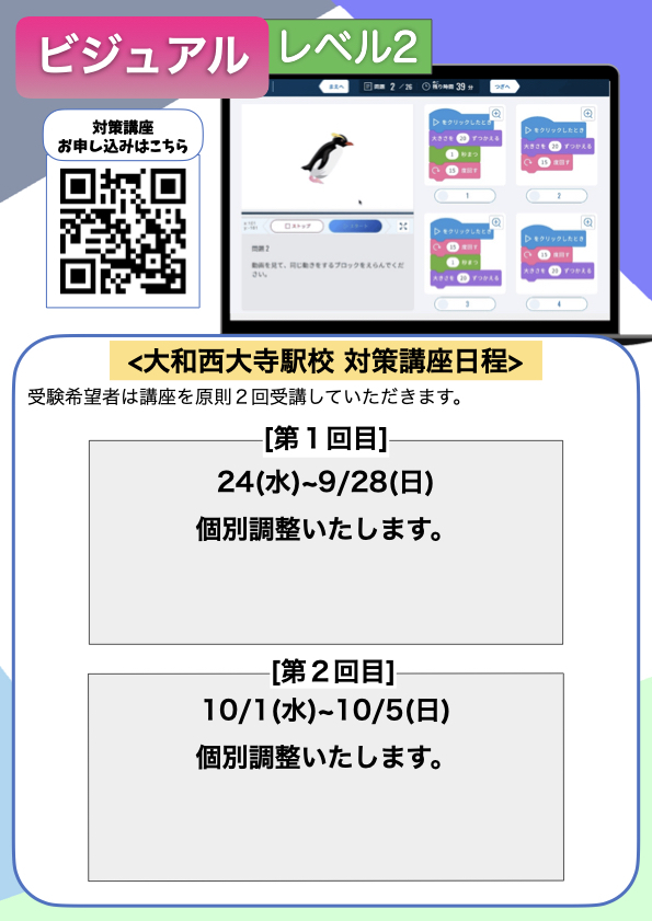今回クリエイタークラス在籍生を対象に「ビジュアル言語レベル2」のプログラミング検定の対策講座及び本試験を実施いたします。