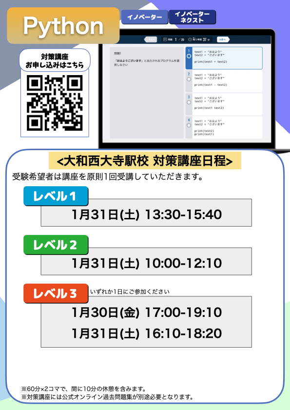 今回イノベーターコース・イノベーターネクストコース在籍生を対象に「Python(レベル1~レベル3)」のプログラミング検定の対策講座及び本試験を実施いたします。