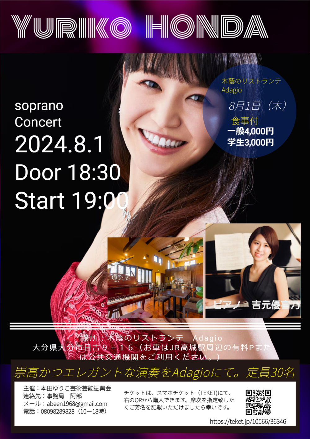 閑静なたたずまいの「木蔭のリストランテ Adagio」にて本格的なソプラノ演奏を「本田ゆりこ」とピアノ「吉元優喜乃」にて