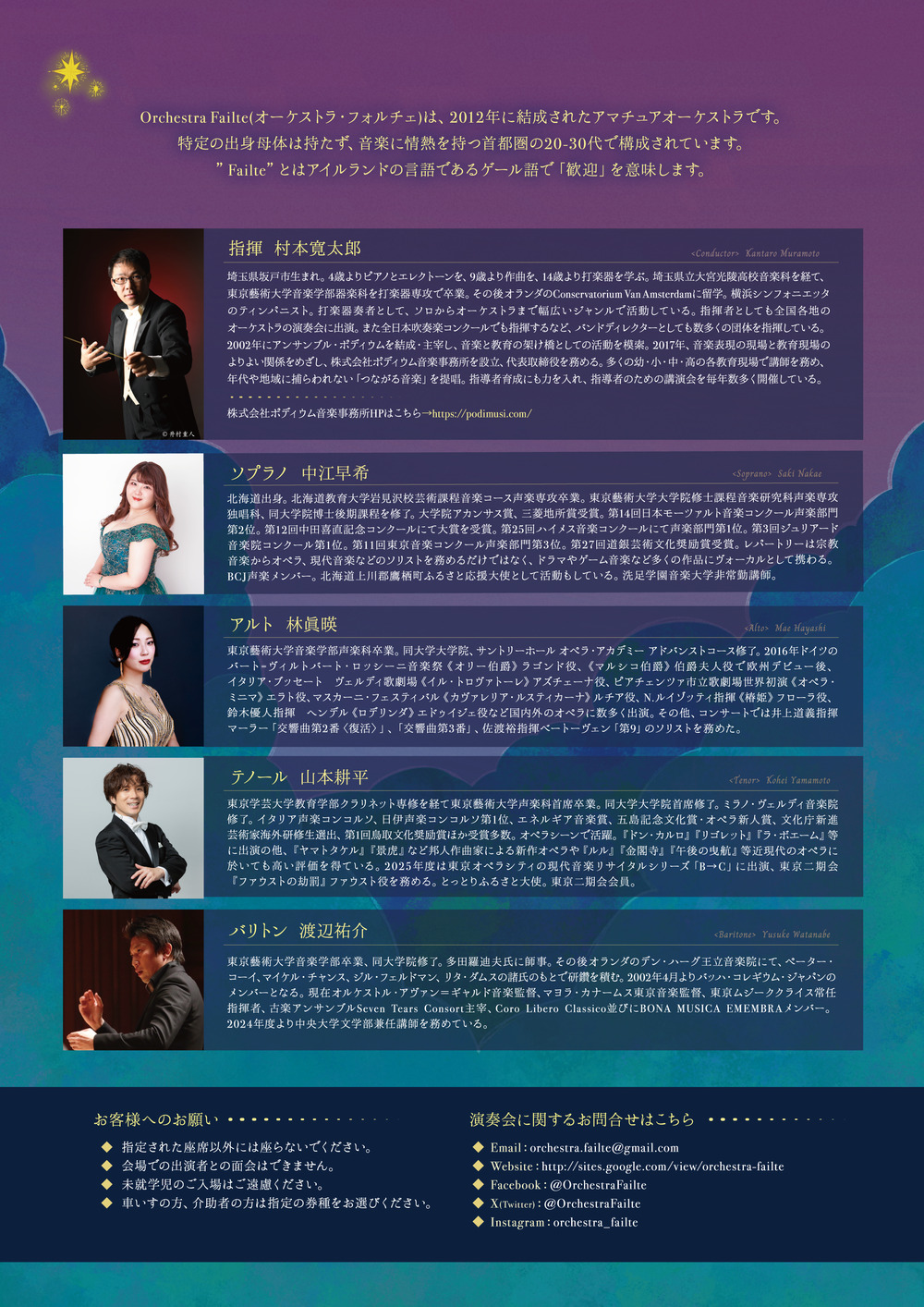Orchestra Failte(オーケストラ・フォルチェ)は、2012年に結成されたアマチュアオーケストラです。特定の出身母体は持たず、音楽に情熱を持つ首都圏の20-30代で構成されています。