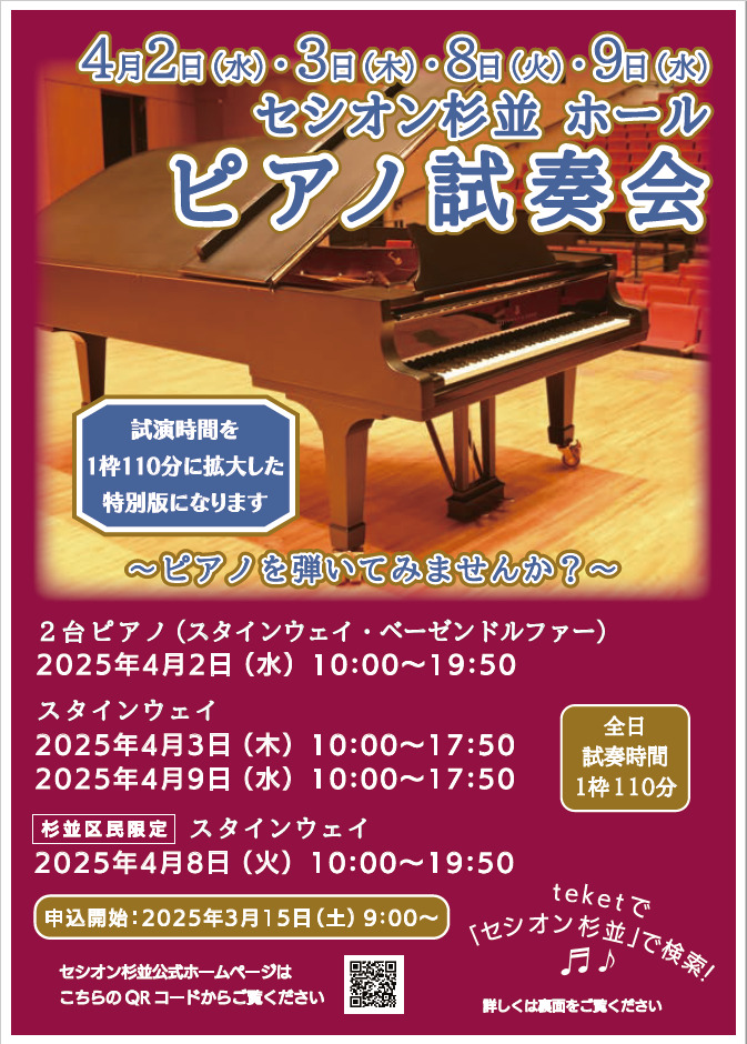 スタインウェイ(D-274)フルコンサートグランドピアノと、ベーゼンドルファー(225)セミコンサートグランドピアノの2台を弾いていただけます。ピアノ位置は固定です。