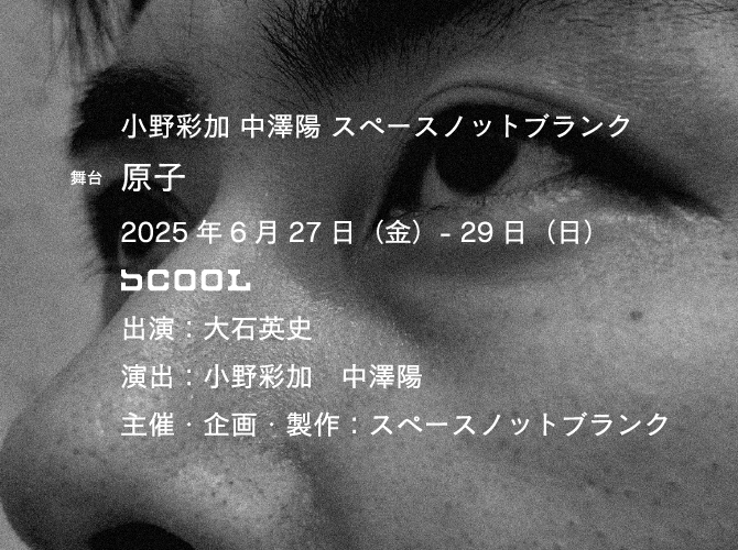 『舞台らしきモニュメント』『言葉とシェイクスピアの鳥』に続く、物体三部作・第三部、その始まり。独白劇『原子』、群像劇『フルクサス』、対話劇『愛無限』の全三篇から成る舞台『原子 フルクサス 愛無限』の第一篇。小野彩加 中澤陽 スペースノットブランクによる独自のメカニズム「聞き取り」を展開してテキストを生成し、編集し、「戯曲」を創造する。