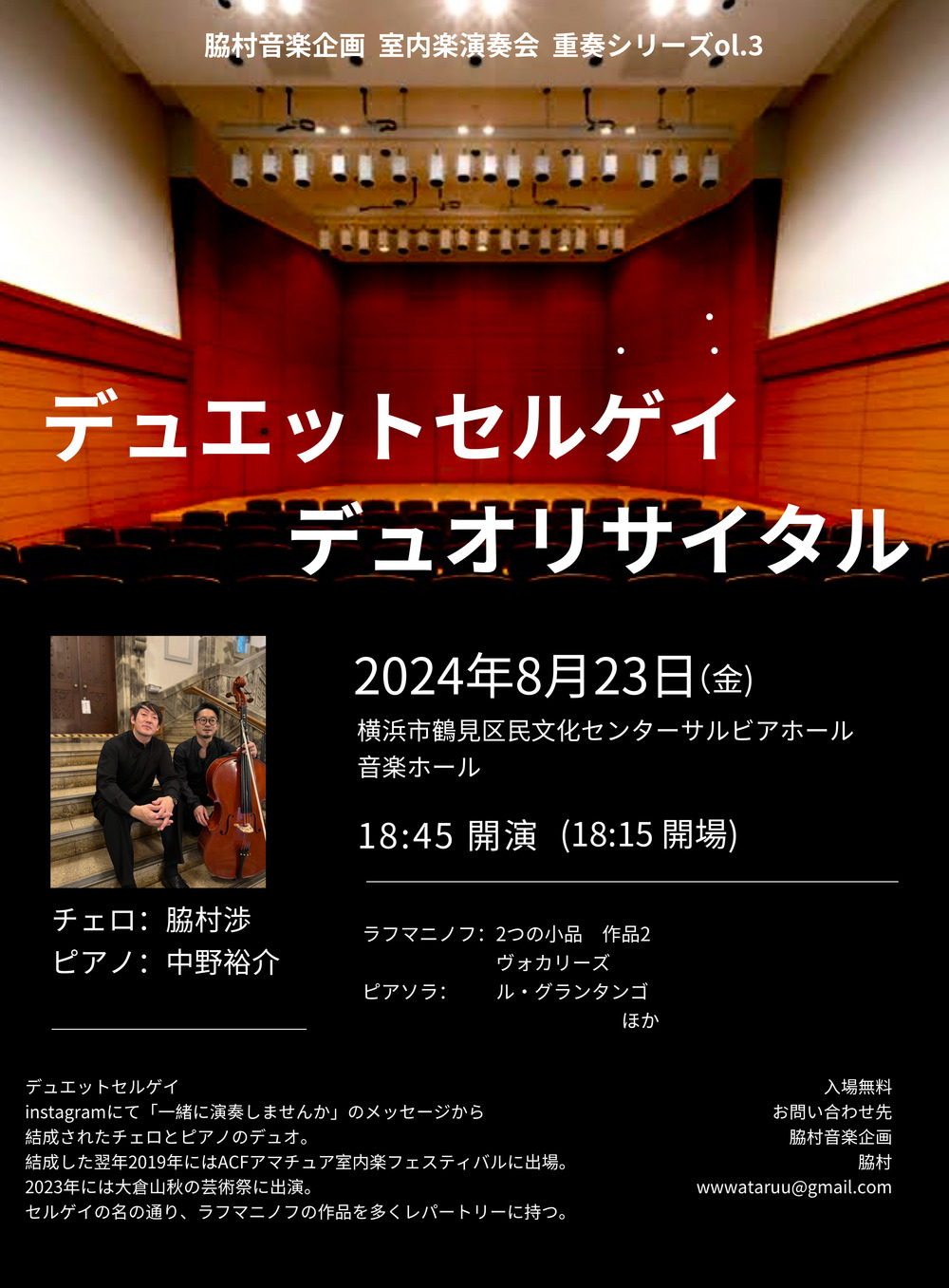 「一緒に演奏しませんか。」 Instagramのメッセージをきっかけに2019年に結成されたチェロとピアノのデュオ。 ラフマニノフの作品をレパートリーにもつ…