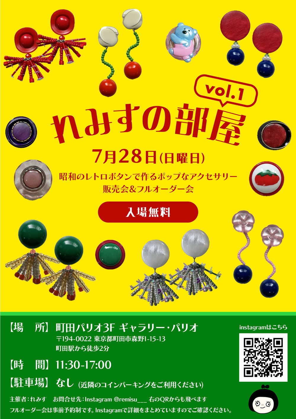 れみすのアトリエにあるたくさんのレトロボタン、ビーズを個展に持っていきます。その中からあなただけのお気に入りの組み合わせを考えて、素敵な耳飾りを作りましょう!