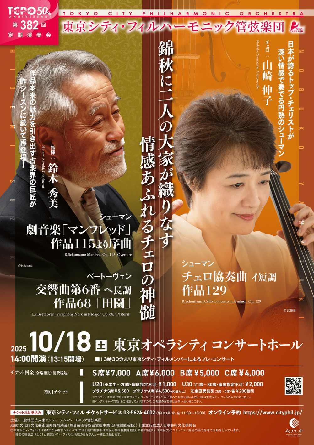 好評を得た昨シーズンに続いて鈴木秀美が登場!三大チェロ協奏曲のひとつで難曲のシューマン《チェロ協奏曲》を披露するのは日本チェロ会を牽引する山崎伸子。この貴重な共演は見逃せません。