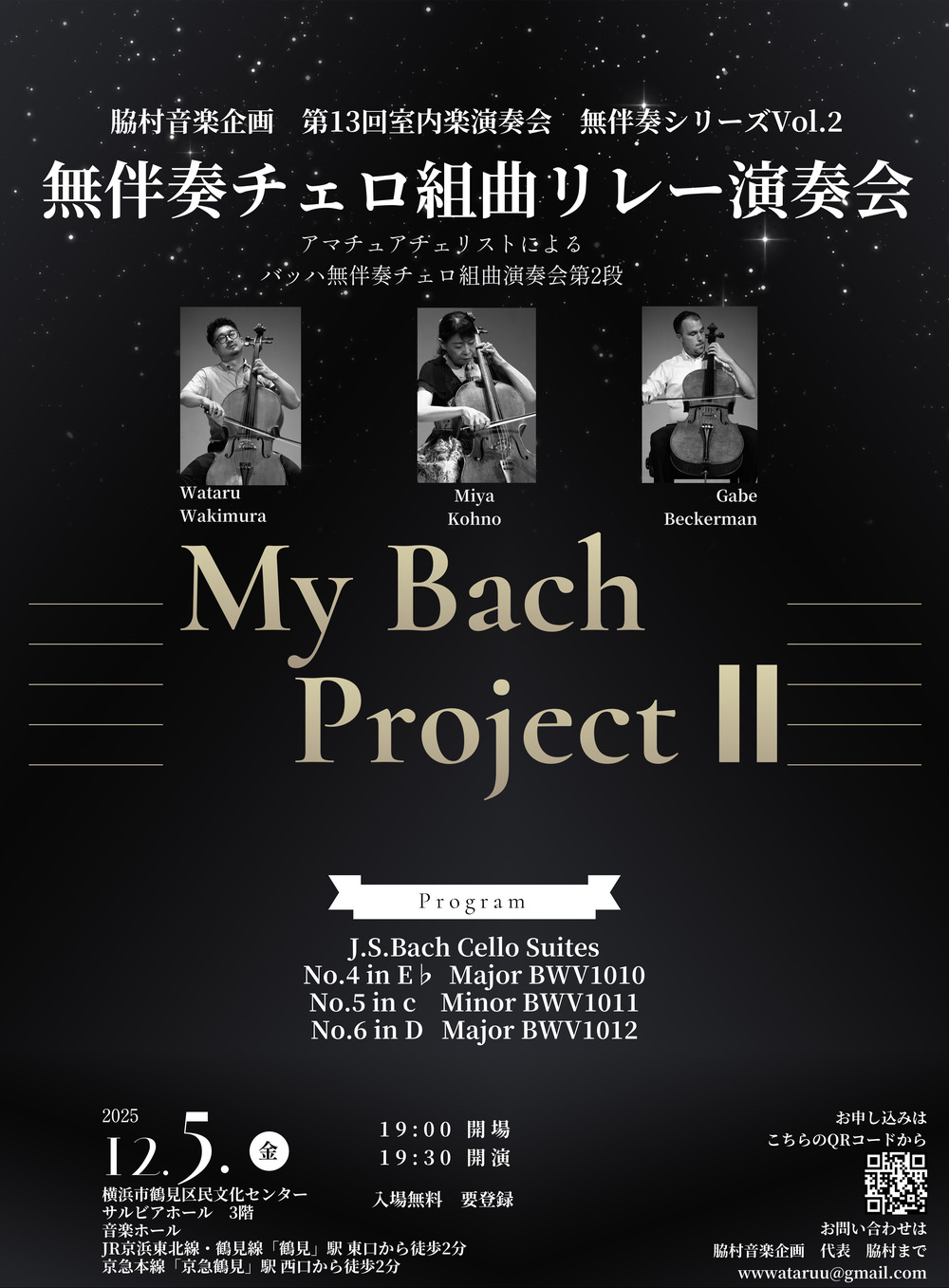 アマチュアチェロ奏者によるバッハ無伴奏チェロ組曲のリレー演奏会。2回目の今回は高度な技術を求められる後半の4番、5番、6番を取り上げます。
