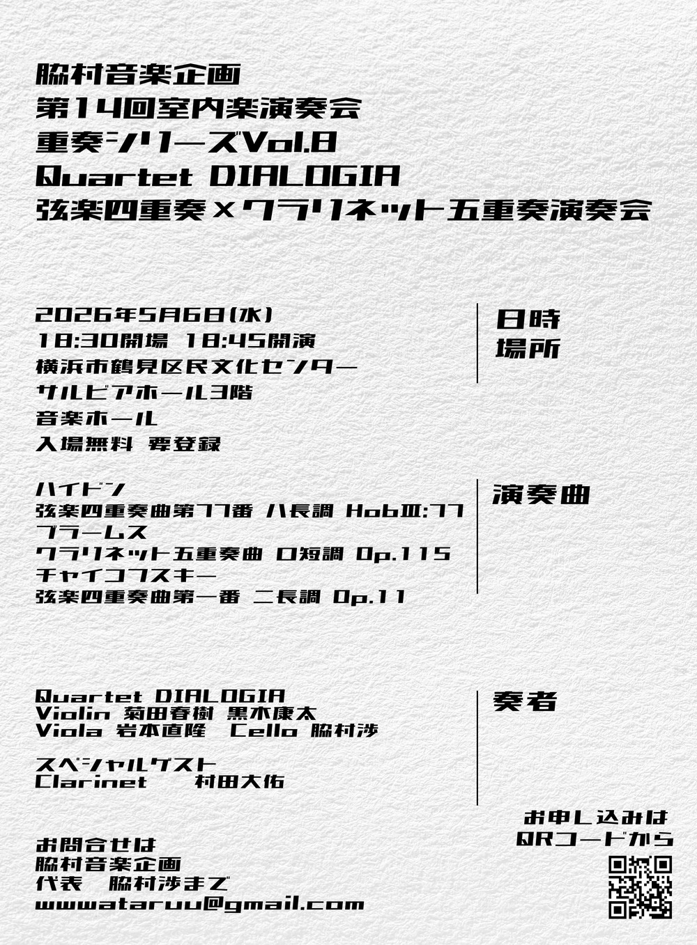 本日はあまりにも有名なチャイコフスキーの弦楽四重奏曲第一番をメインに、基礎力を問われるハイドンの皇帝、そしてクラリネットの村田大佑氏を招きブラームス最晩年の傑作クラリネット五重奏曲をお届けします。