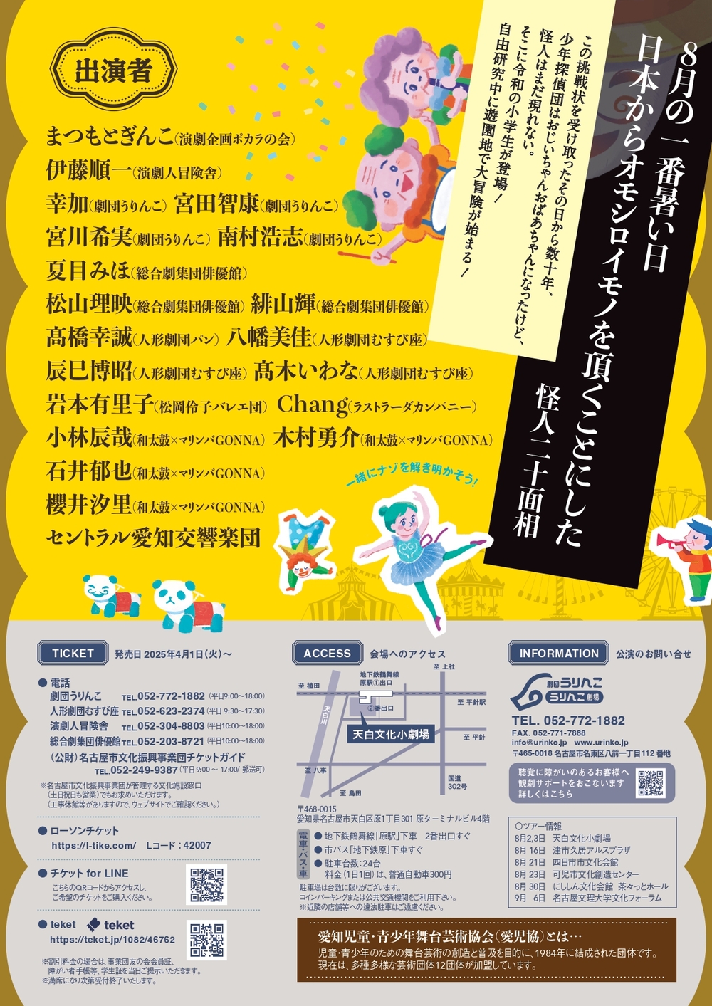 まつもとぎんこ(演劇企画ポカラの会)、伊藤順一(演劇人冒険舎)、幸加(劇団うりんこ)、宮田智康(劇団うりんこ)、宮川希実(劇団うりんこ)、南村浩志(劇団うりんこ)、夏目みほ(総合劇集団俳優館)、松山理映(総合劇集団俳優館)、緋山輝(総合劇集団俳優館)、髙橋幸誠(人形劇団パン)、八幡美佳(人形劇団むすび座)、辰巳博昭(人形劇団むすび座)、髙木いわな(人形劇団むすび座)、岩本有里子(松岡伶子バレエ団)、Chang(ラストラーダカンパニー)、小林辰哉(和太鼓×マリンバGONNA)、木村勇介(和太鼓×マリンバGONNA)、石井郁也(和太鼓×マリンバGONNA)、櫻井汐里(和太鼓×マリンバGONNA)