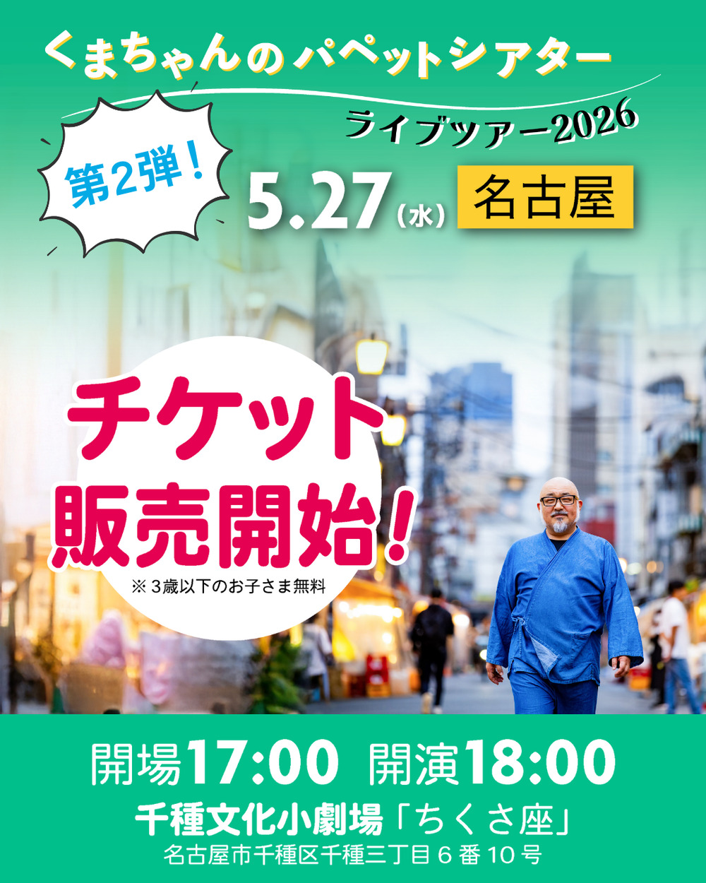 NHK Eテレ「阿佐ヶ谷アパートメント」内の『天才数珠つなぎコーナー』で「人を癒せる天才」として登場した くまちゃんが名古屋にやって来ます♪