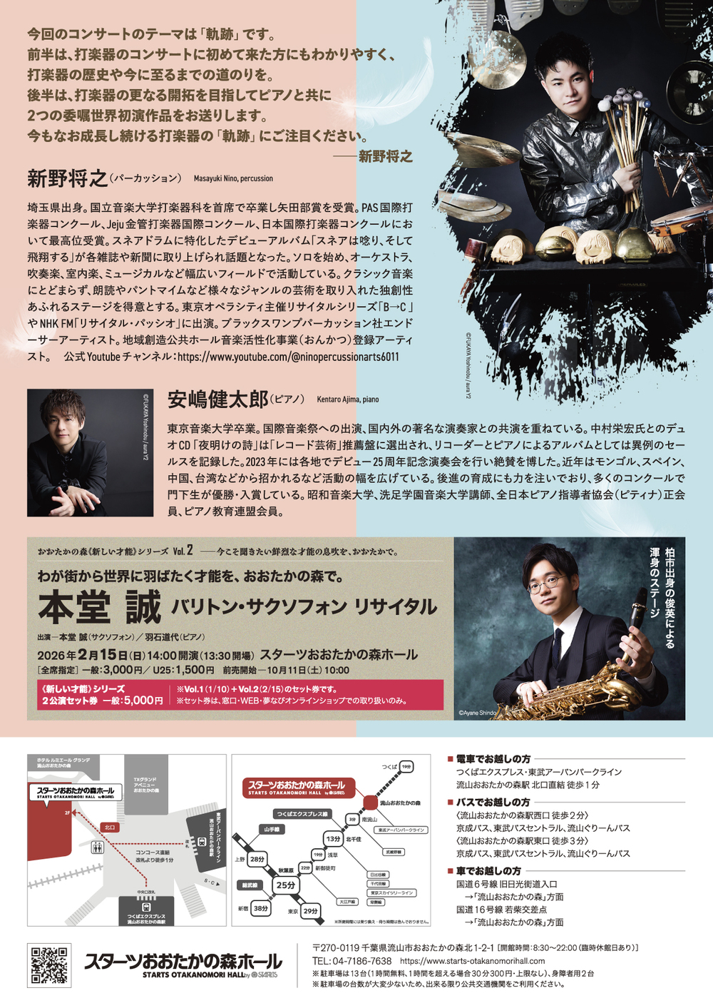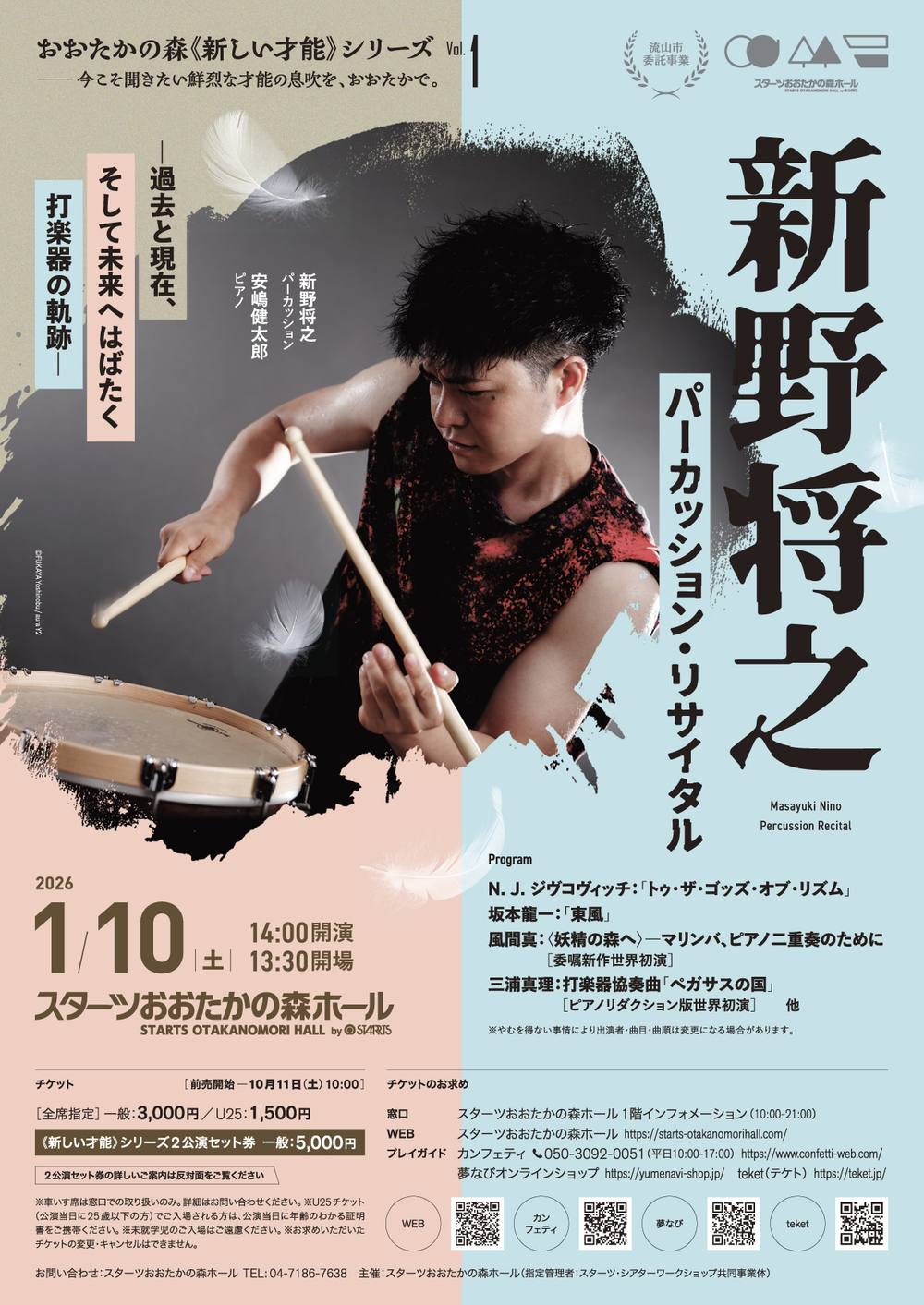 スターツおおたかの森ホールが気鋭の音楽家を迎えて贈るコンサートシリーズ。第1弾は打楽器奏者の新野将之が登場します。