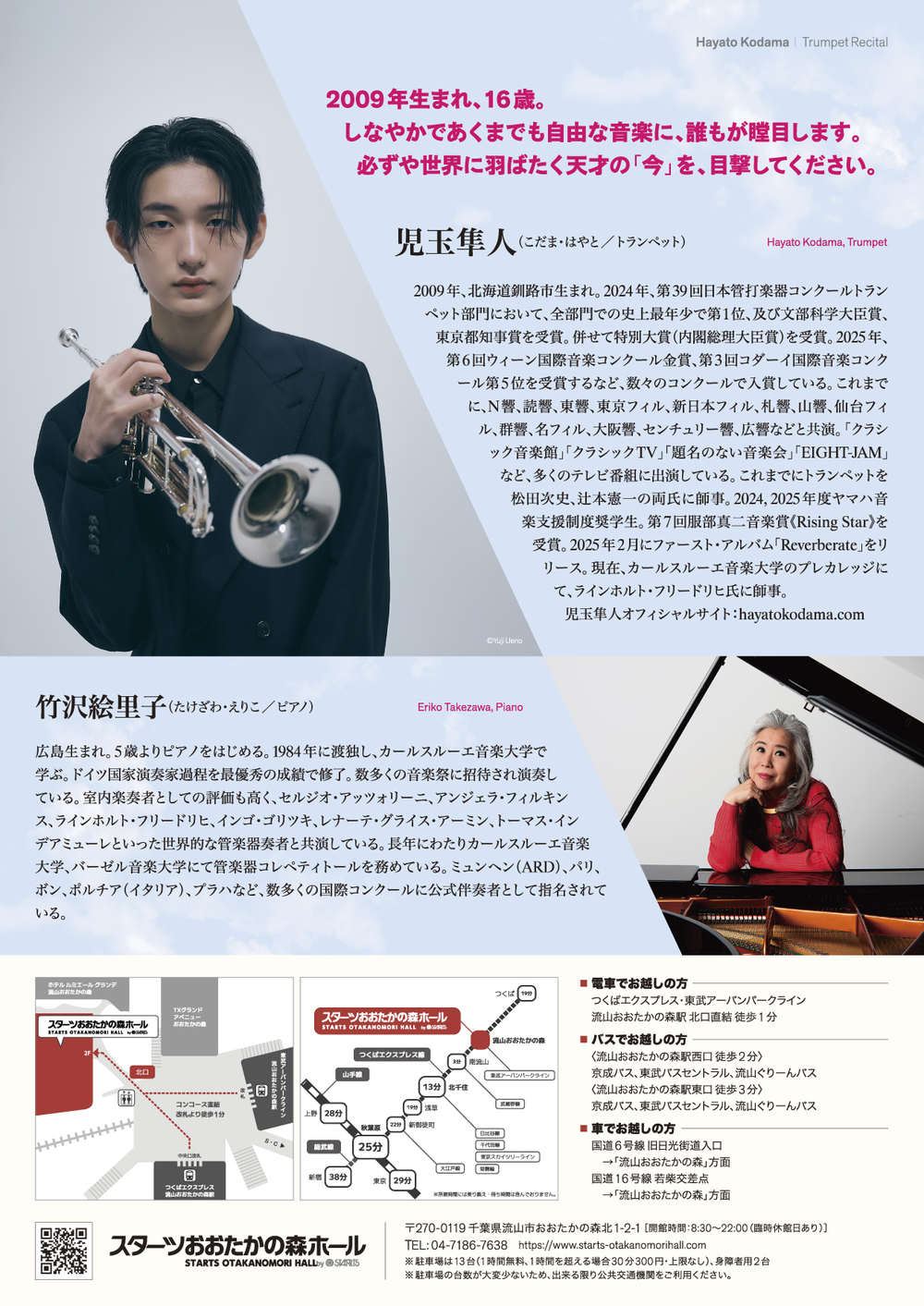 スターツおおたかの森ホールが気鋭の音楽家を迎えて贈るコンサートシリーズ。第3弾は、日本管打楽器コンクール史上最年少第1位(2024年)に輝いた、トランペット奏者の児玉隼人。2009年生まれの若き天才が放つ、鮮烈な音楽をご堪能ください。