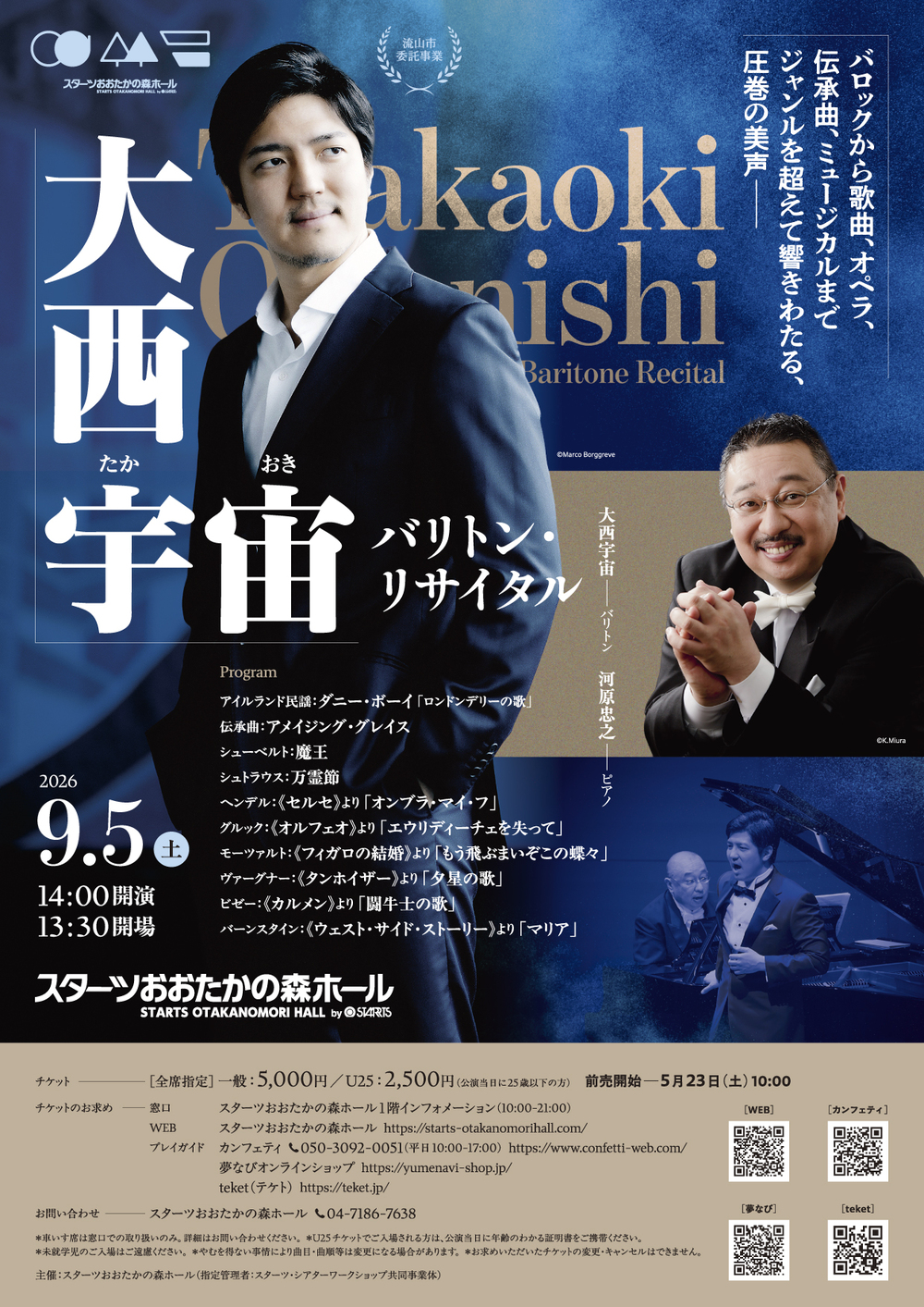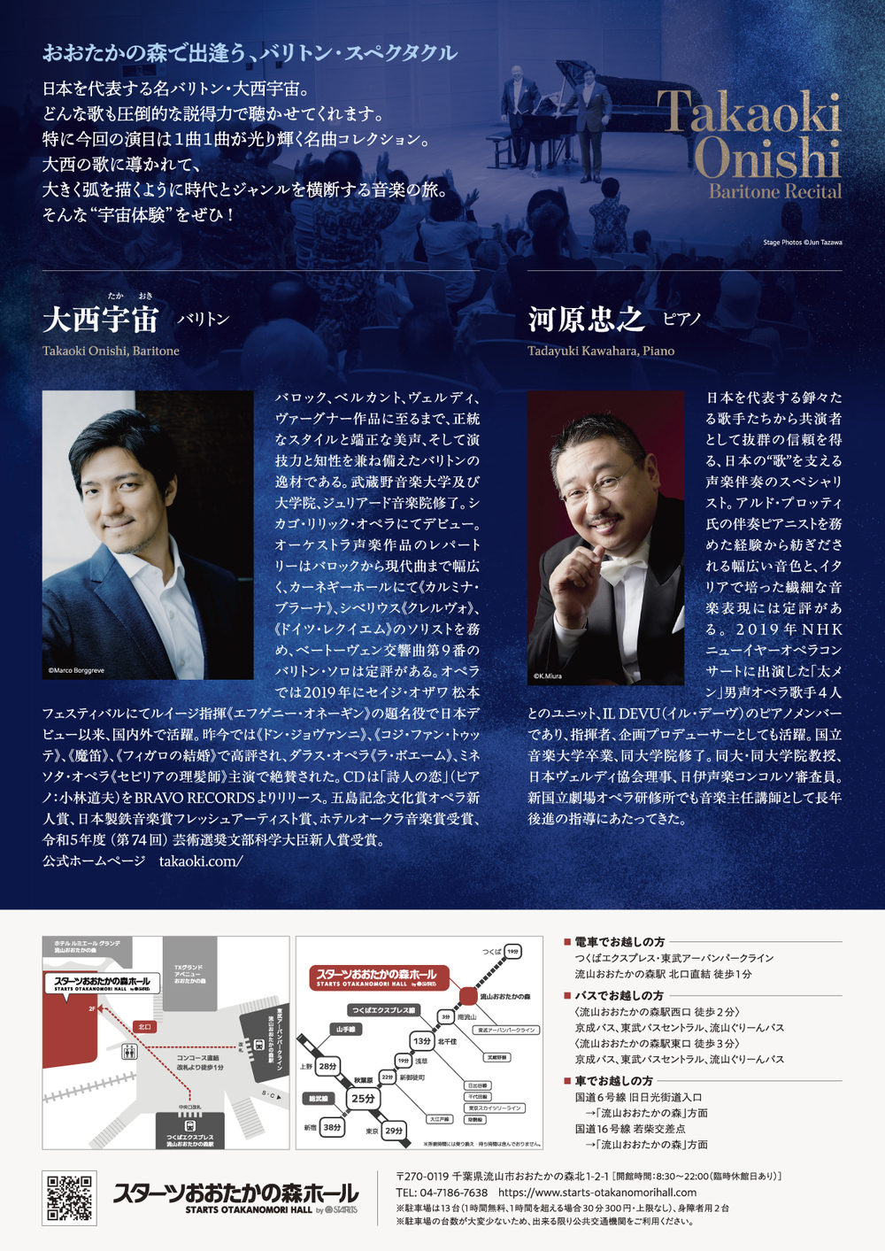 日本を代表する名バリトン、大西宇宙(おおにし・たかおき)。どんな歌も圧倒的な説得力で聴かせてくれます。特に今回の演目は1曲1曲が光り輝く名曲コレクション。大西の歌に導かれて、大きく弧を描くように時代とジャンルを横断する音楽の旅。そんな“宇宙体験”をぜひ! ピアノ共演は、多くの声楽家たちが厚い信頼を寄せる河原忠之。