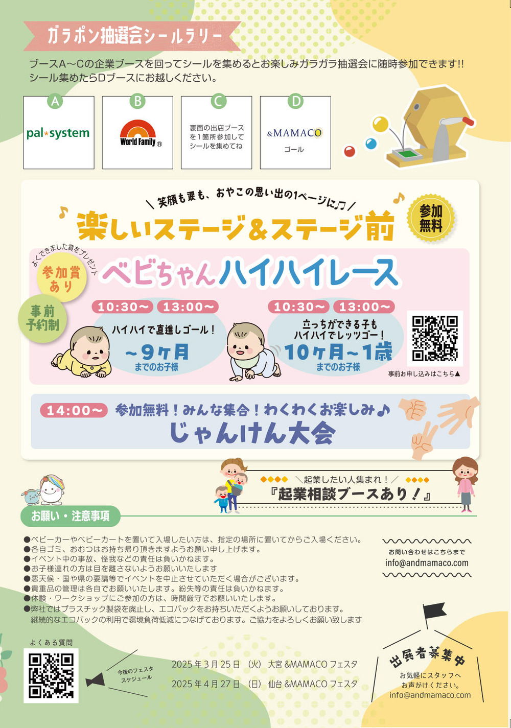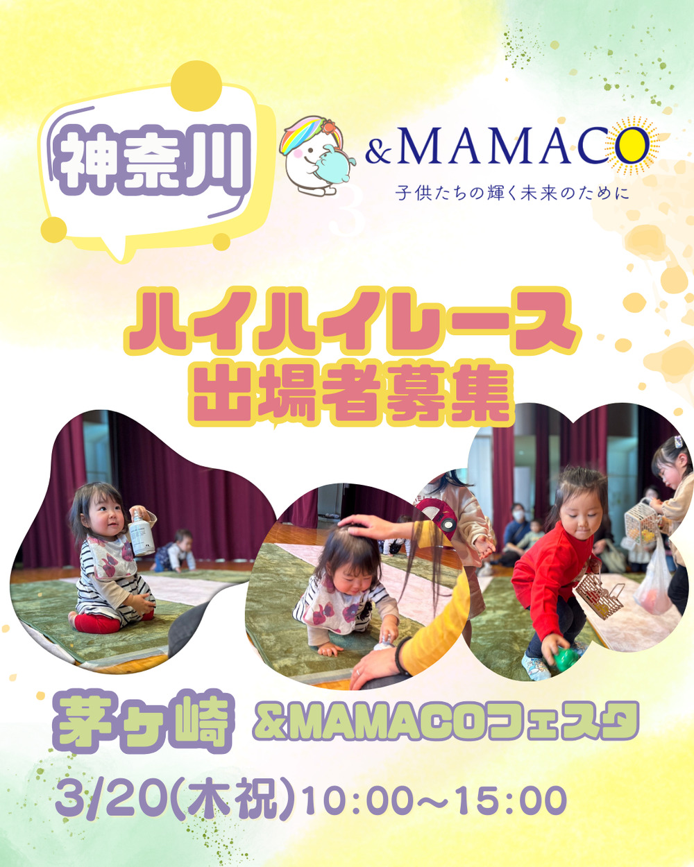 ■主旨:4月は心機一転スタートをする方も多いかと思います4月に向かい新しいことにチャレンジする方をワクワクドキドキで迎え、スタートをするきっかけ、活動の場を作り、子育てママと社会をつなぐ!女性と企業を繋ぐ 子供はもちろん家族で楽しめるファミリーフェスタ! を開催ハイハイレースも開催♪