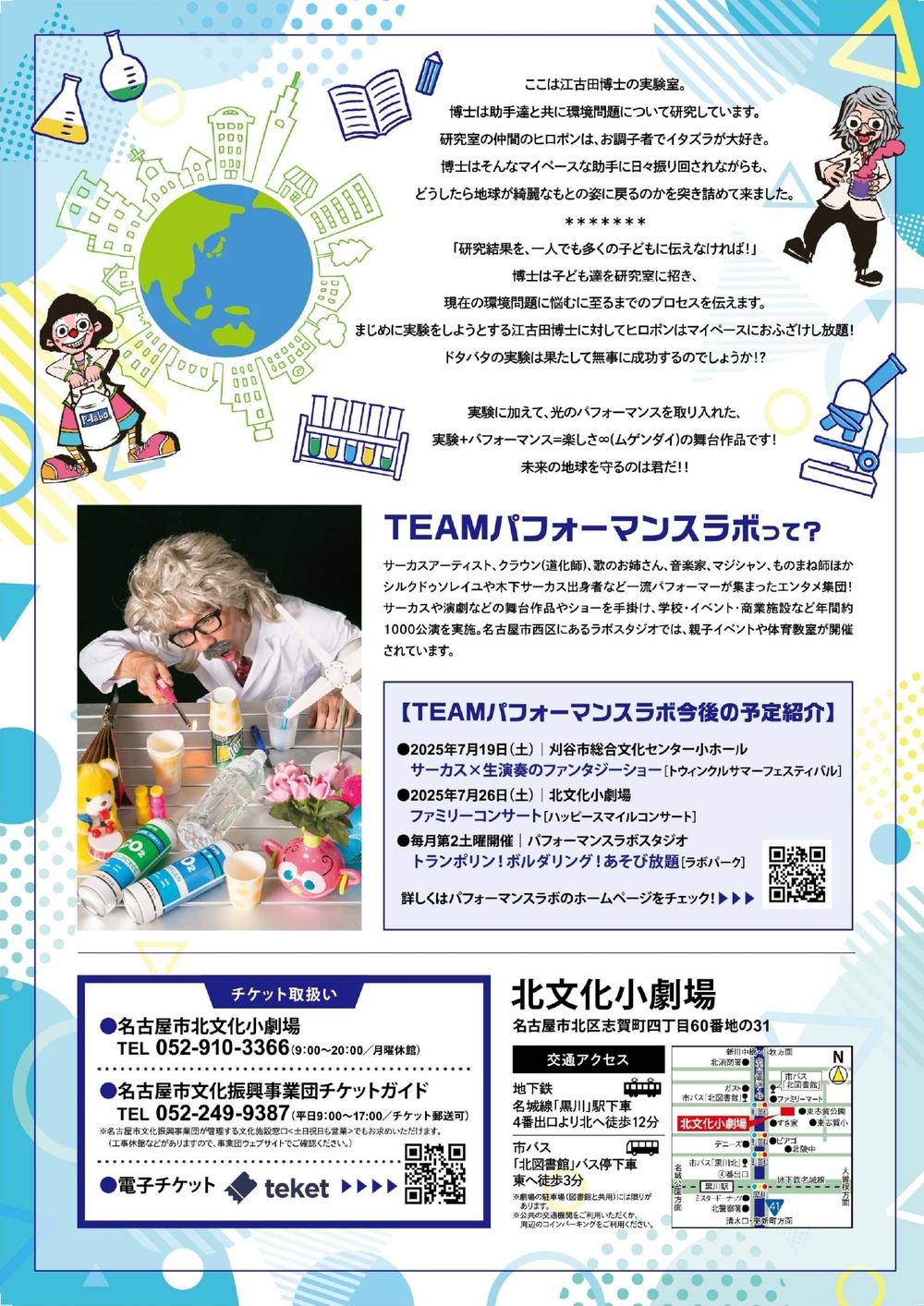 ここは江古田博士の実験室。実験室では今日も環境問題について研究中です。助手のヒロポンはマイペースにおふざけし放題。ドタバタの実験は果たして無事に成功するのでしょうか!?実験に加えて光のパフォーマンスを取り入れた舞台作品です。未来の地球を守るのは君だ!