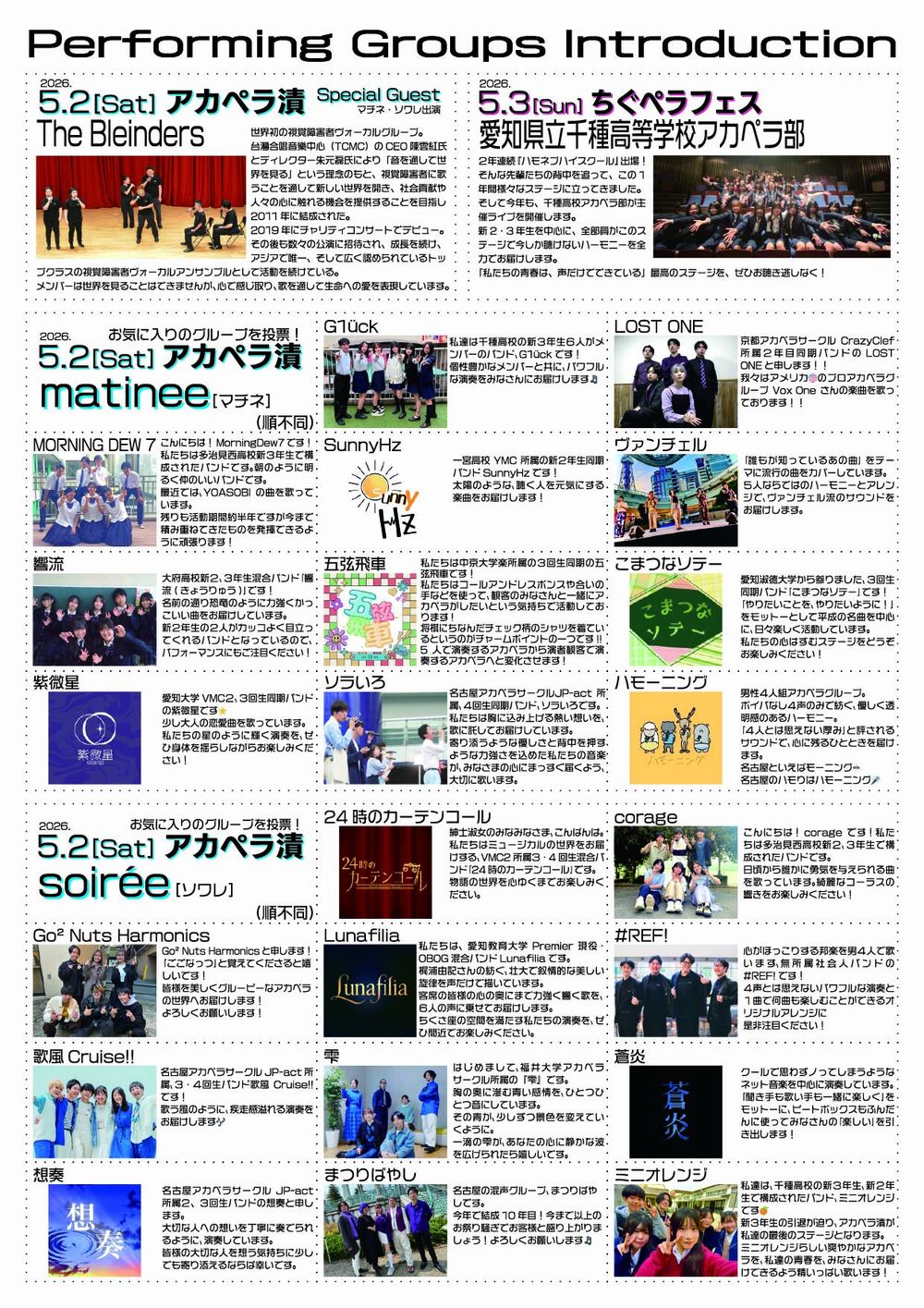 24時のカーテンコール、corage、Go² Nuts Harmonics、Lunafilia、#REF!、歌風Cruise‼、雫、蒼炎、想奏、まつりばやし、ミニオレンジ