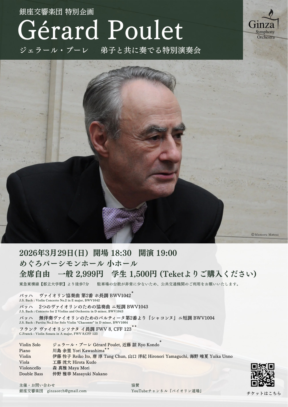 このコンサートでは名曲にも関わらず普段プーレ氏の演奏を聴くことができないバッハ ヴァイオリン協奏曲第2番、ドッペルコンチェルトを現在の弟子と共に奏でます。カール・フレッシュ→ヘンリク・シェリング→ジェラール・プーレと伝わり受け継がれてきた音楽は、こうして確実に後世に残っていきます。その一端を感じていただけるのではないかと思います。