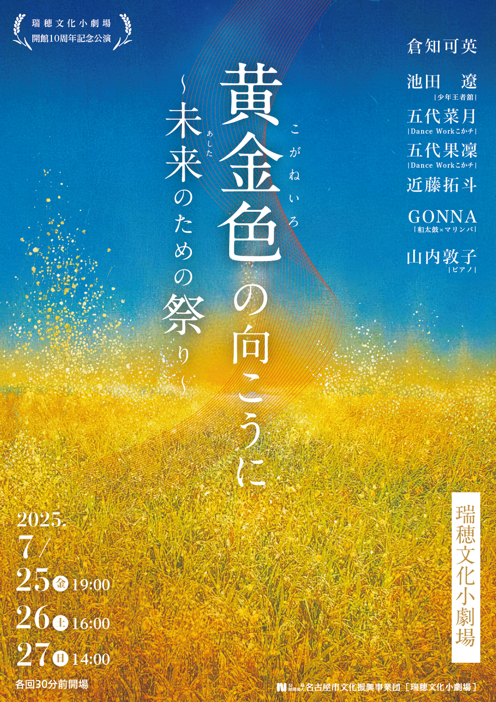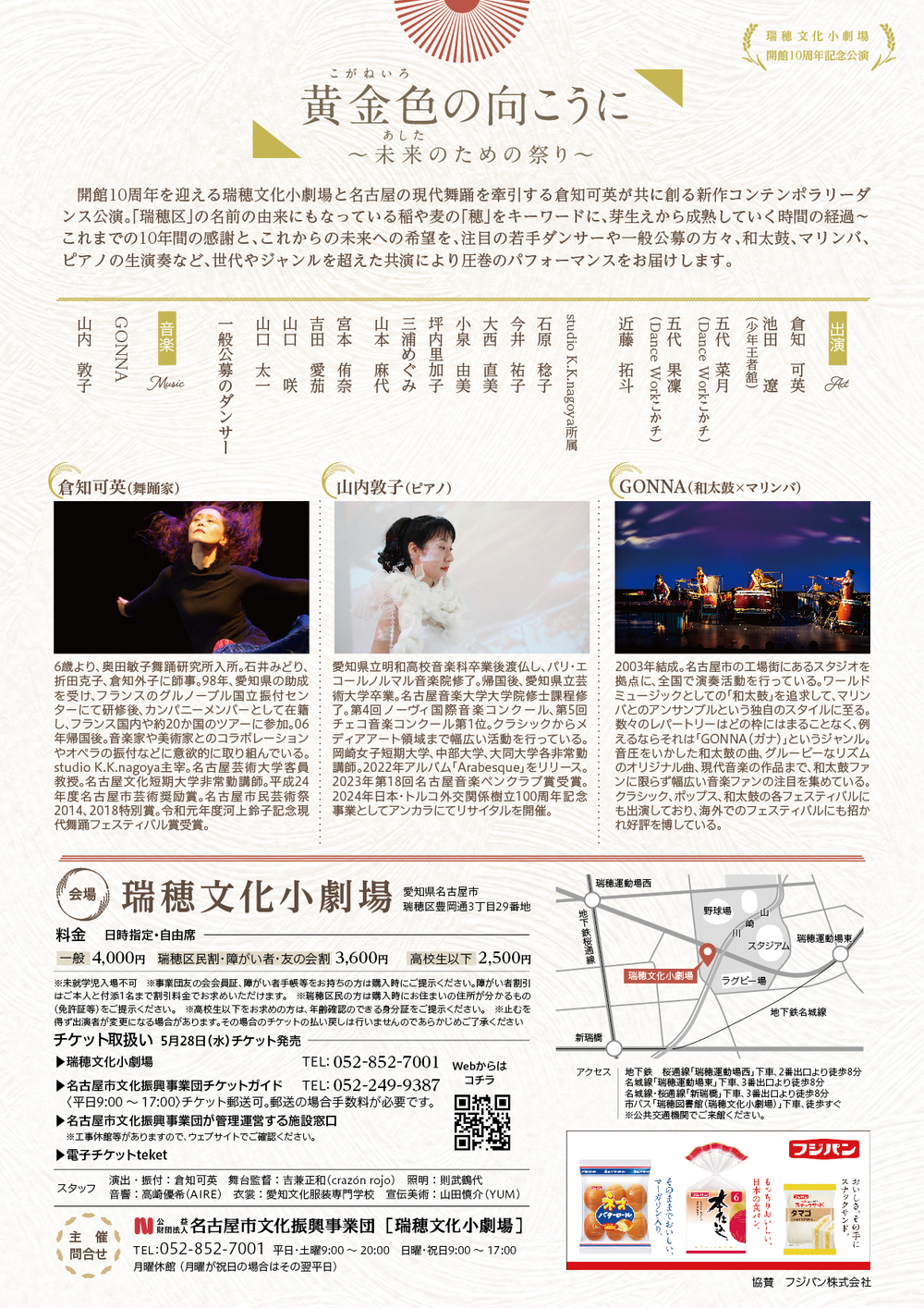 「瑞穂区」の名前の由来にもなっている稲や麦の「穂」をキーワードに、芽生えから成熟していく時間の経過~これまでの10年間の感謝と、これからの未来への希望を、注目の若手ダンサーや一般公募の方々、和太鼓、マリンバ、ピアノの生演奏など、世代やジャンルを超えた共演により圧巻のパフォーマンスをお届けします。