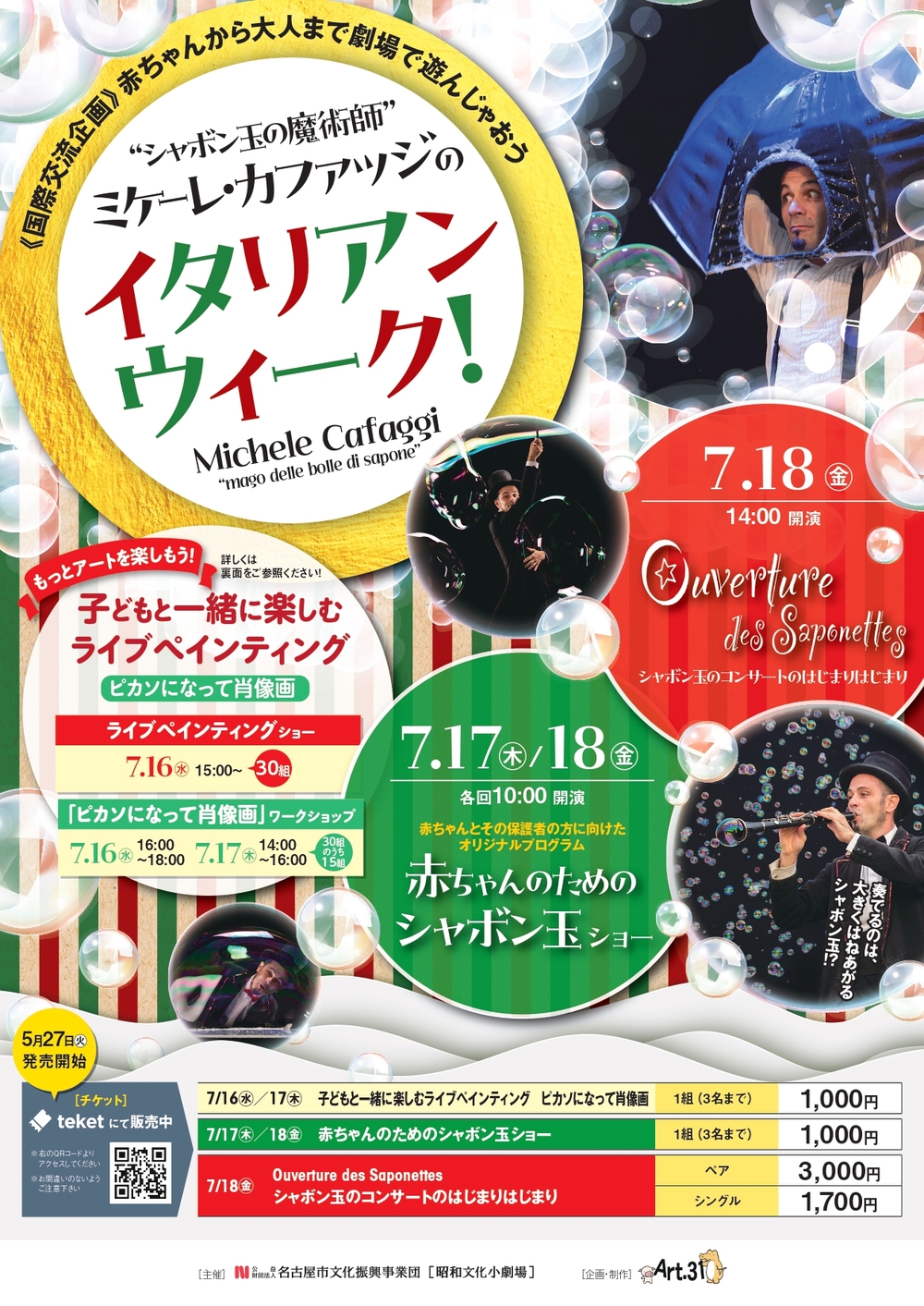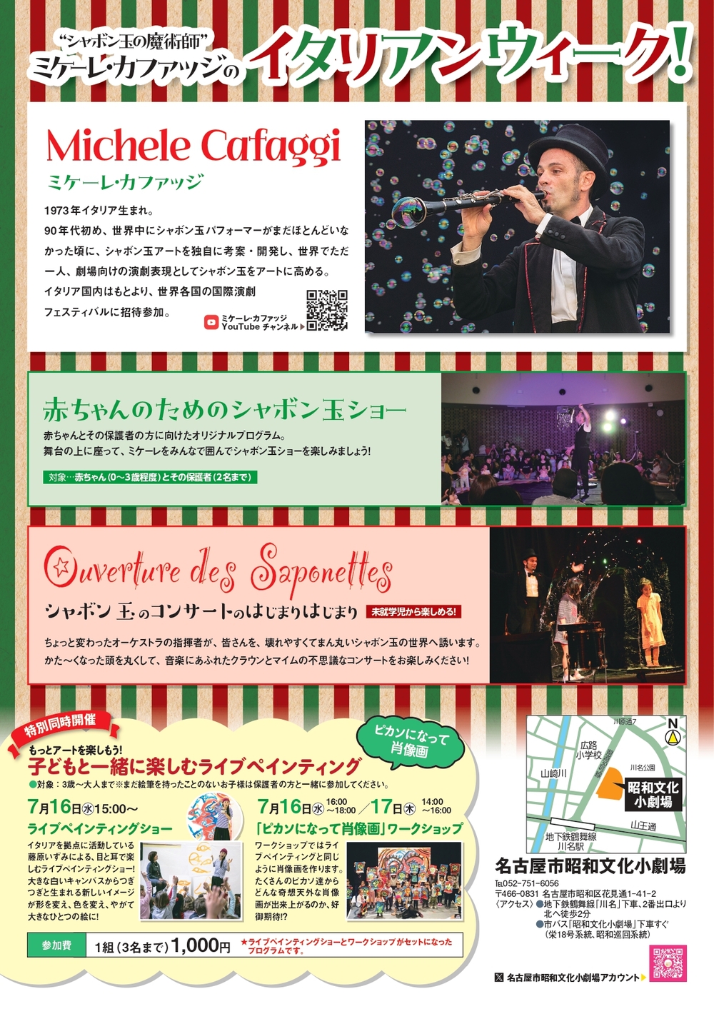 シャボン玉の魔術師ミケーレ・カファッジによる、幻想的なシャボン玉ショーを楽しめる他、イタリアで活動している藤原いずみによる全身で楽しいライブペインティング&ワークショップも見どころ!