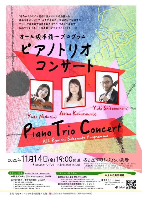 東海地区を中心に活躍するクラシック演奏家によるピアノトリオの生演奏で、坂本龍一氏の音楽世界を存分にお楽しみください。