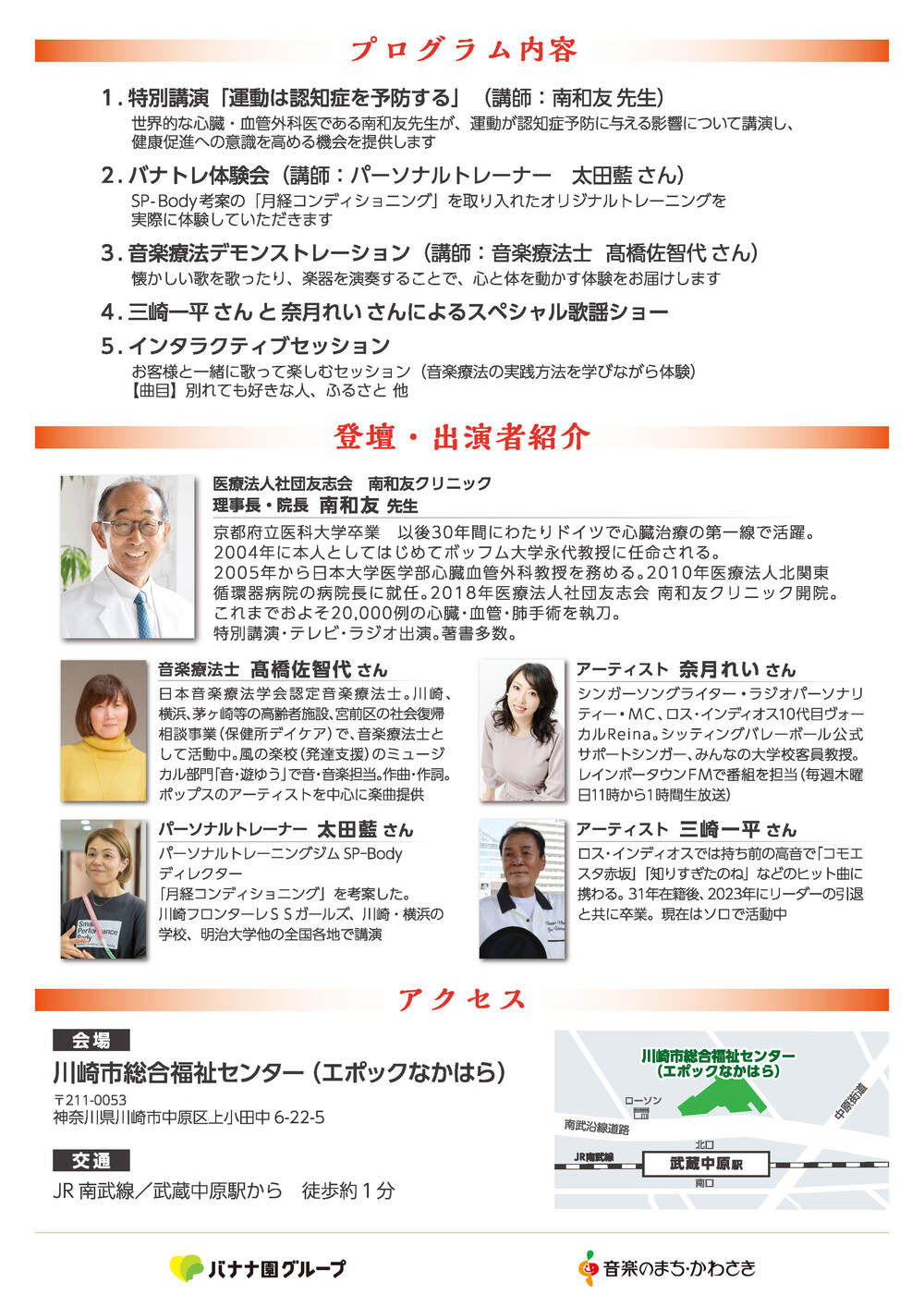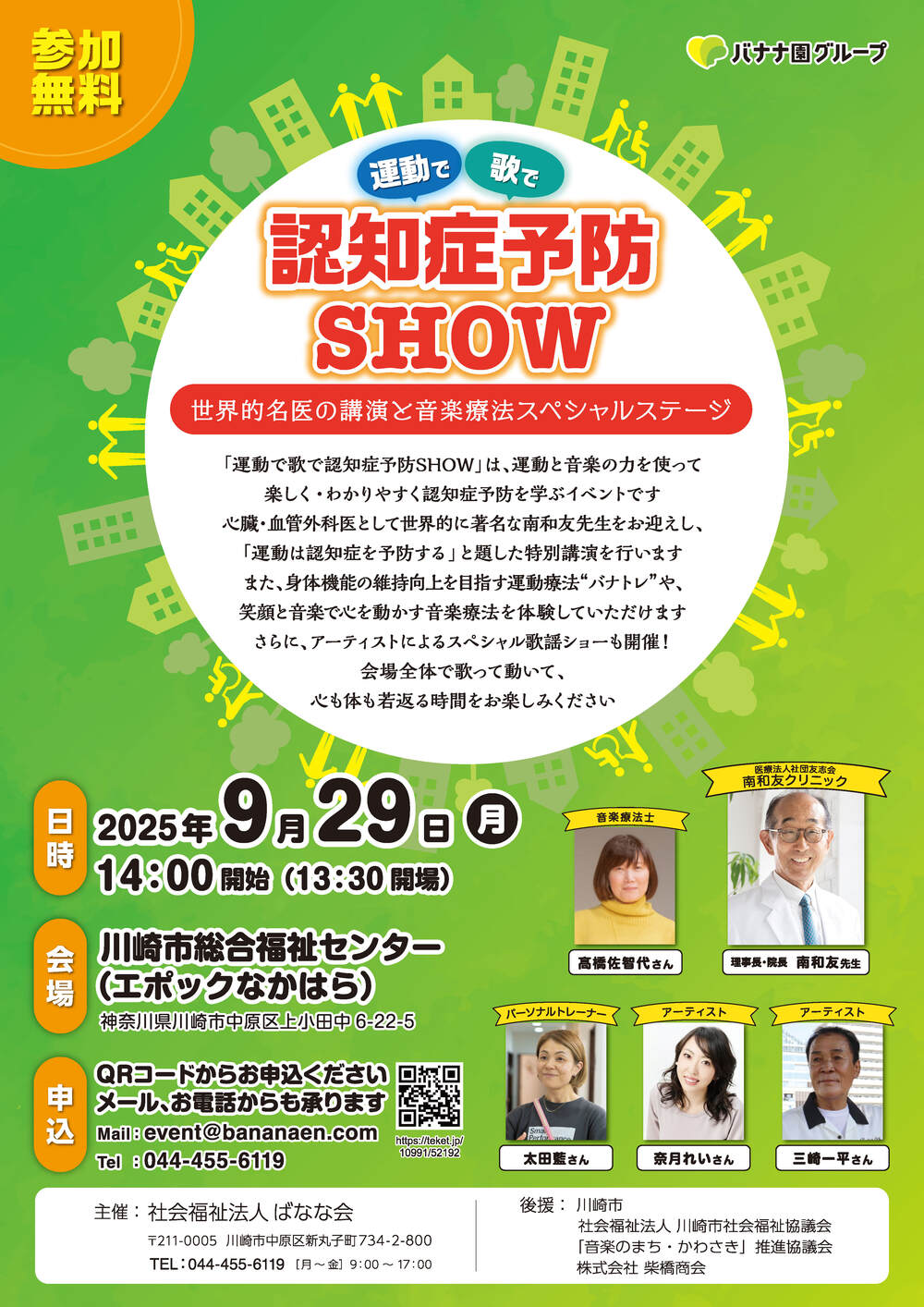 ──世界的名医・南和友先生による特別講演に加え、パーソナルトレーナー・太田藍さんの「バナトレ」実演、音楽療法士・髙橋佐智代さんによる音楽療法の紹介、そして奈月れいさん・三崎一平さんによるスペシャル歌謡ショーまで。盛りだくさんのプログラムで、認知症予防のヒントをお届けします。