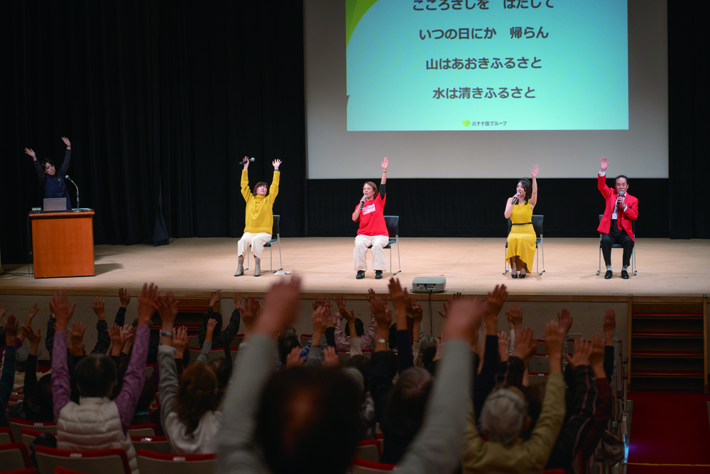 参加者の皆さまと一緒に歌い、体を動かす時間。笑顔あふれるコミュニケーションの場を提供します。