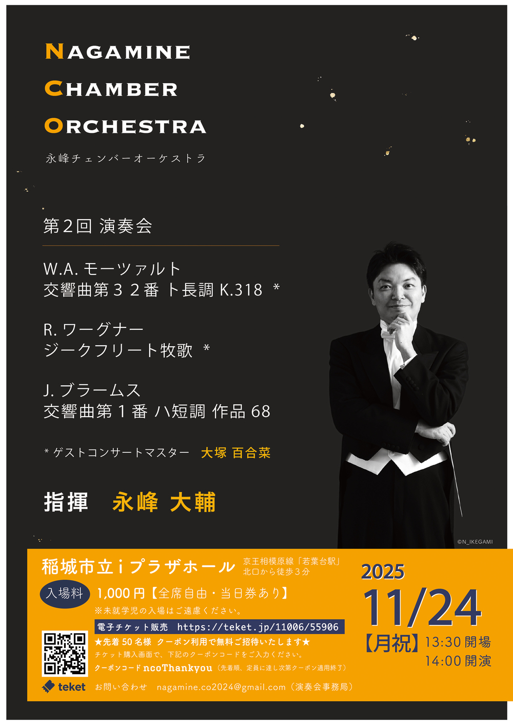 永峰チェンバーオーケストラ(以下NCO)は、指揮者・永峰大輔と共に音楽をしたい、と願うメンバーが集い結成されました。