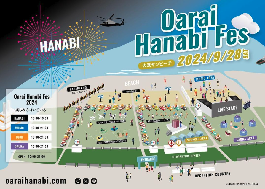⚫️OARAI HANABI FESのサウナエリアは、昨年大好評でした。今年も、海辺に開放的なサウナが登場。海風を感じながらのサウナは格別で、心身をリフレッシュできます。花火×サウナで極上の整いを。最高のリラクゼーション楽しみ自然と一体化した贅沢なひとときをお楽しみください。