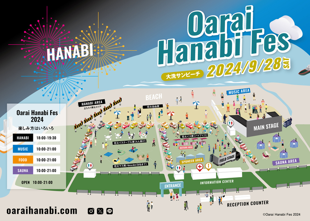 ⚫️OARAI HANABI FESのサウナエリアは、昨年大好評でした。今年も、海辺に開放的なサウナが登場。海風を感じながらのサウナは格別で、心身をリフレッシュできます。花火×サウナで極上の整いを。最高のリラクゼーション楽しみ自然と一体化した贅沢なひとときをお楽しみください。